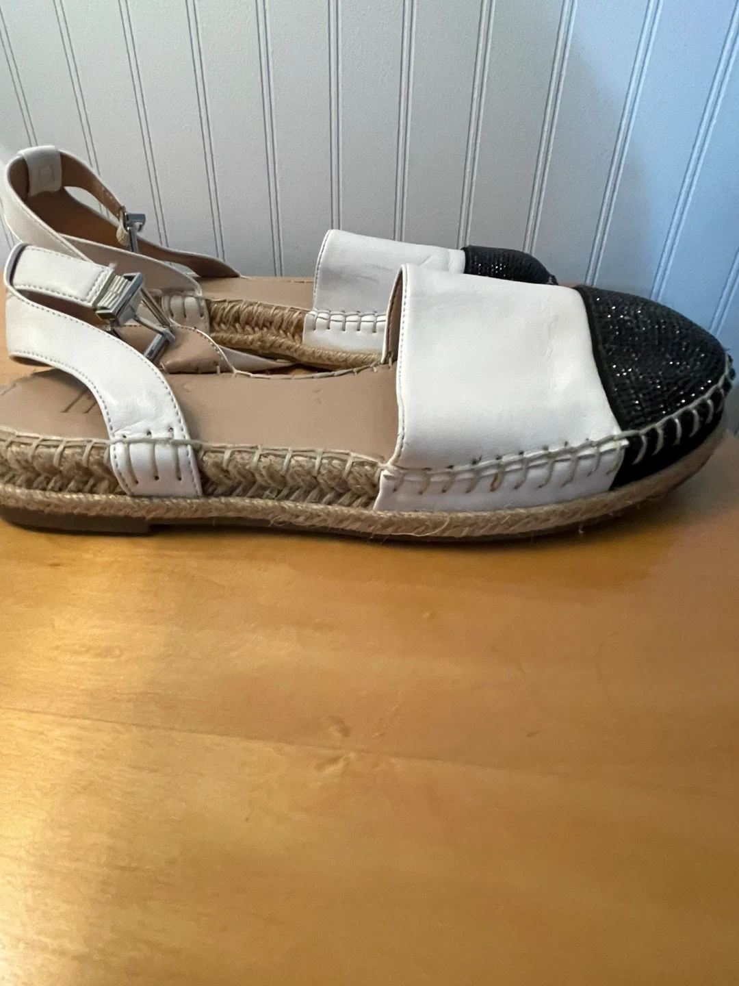 INC International Concepts espadrille flats in white and black. Features a white leather upper with a black, glitter-embellished toe. Jute-wrapped sole with contrast stitching. Includes an adjustable ankle strap.