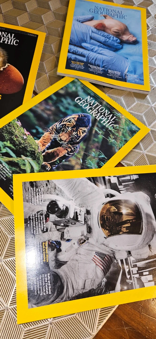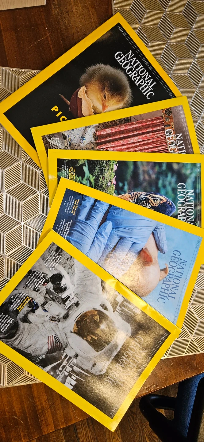 Collection of National Geographic magazines. Includes issues with diverse photography and articles. Perfect for readers interested in science and nature photography!