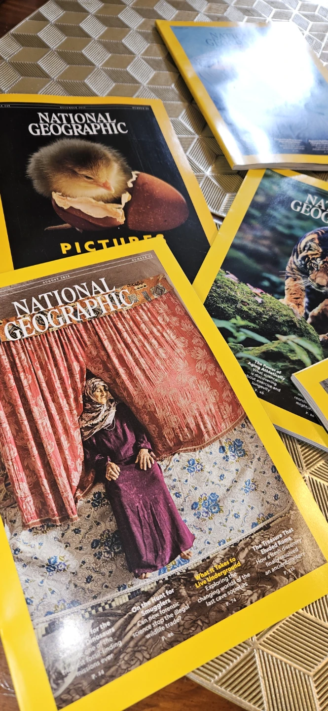 Collection of National Geographic magazines. Includes issues with diverse photography and articles. Perfect for readers interested in science and nature photography!