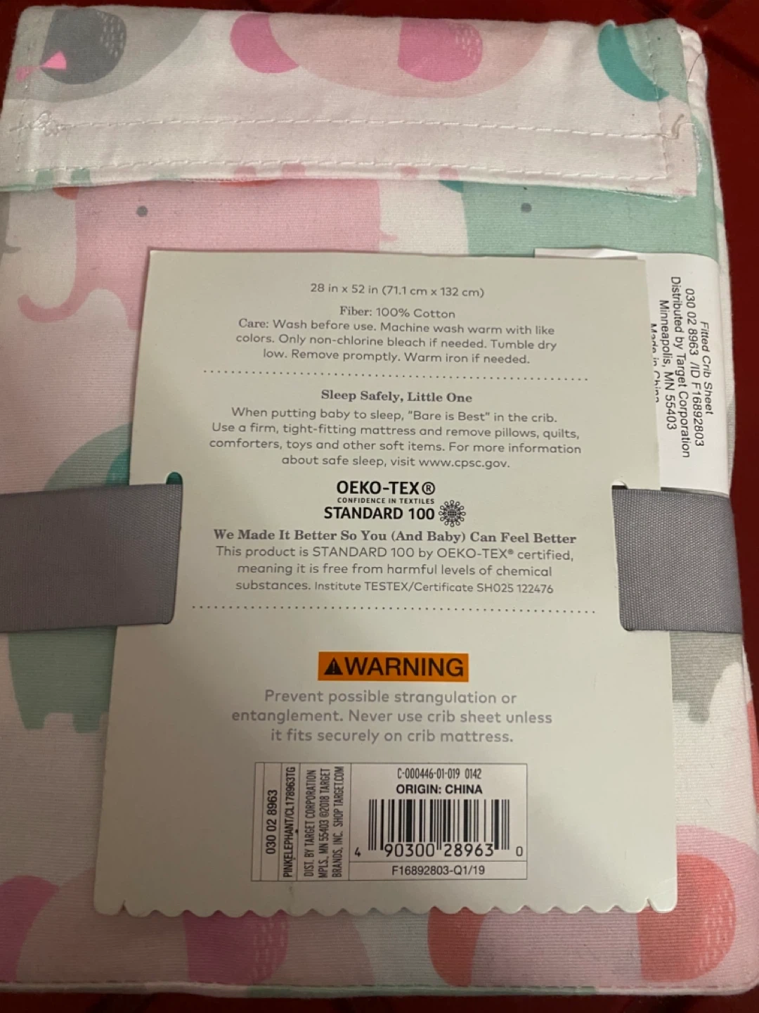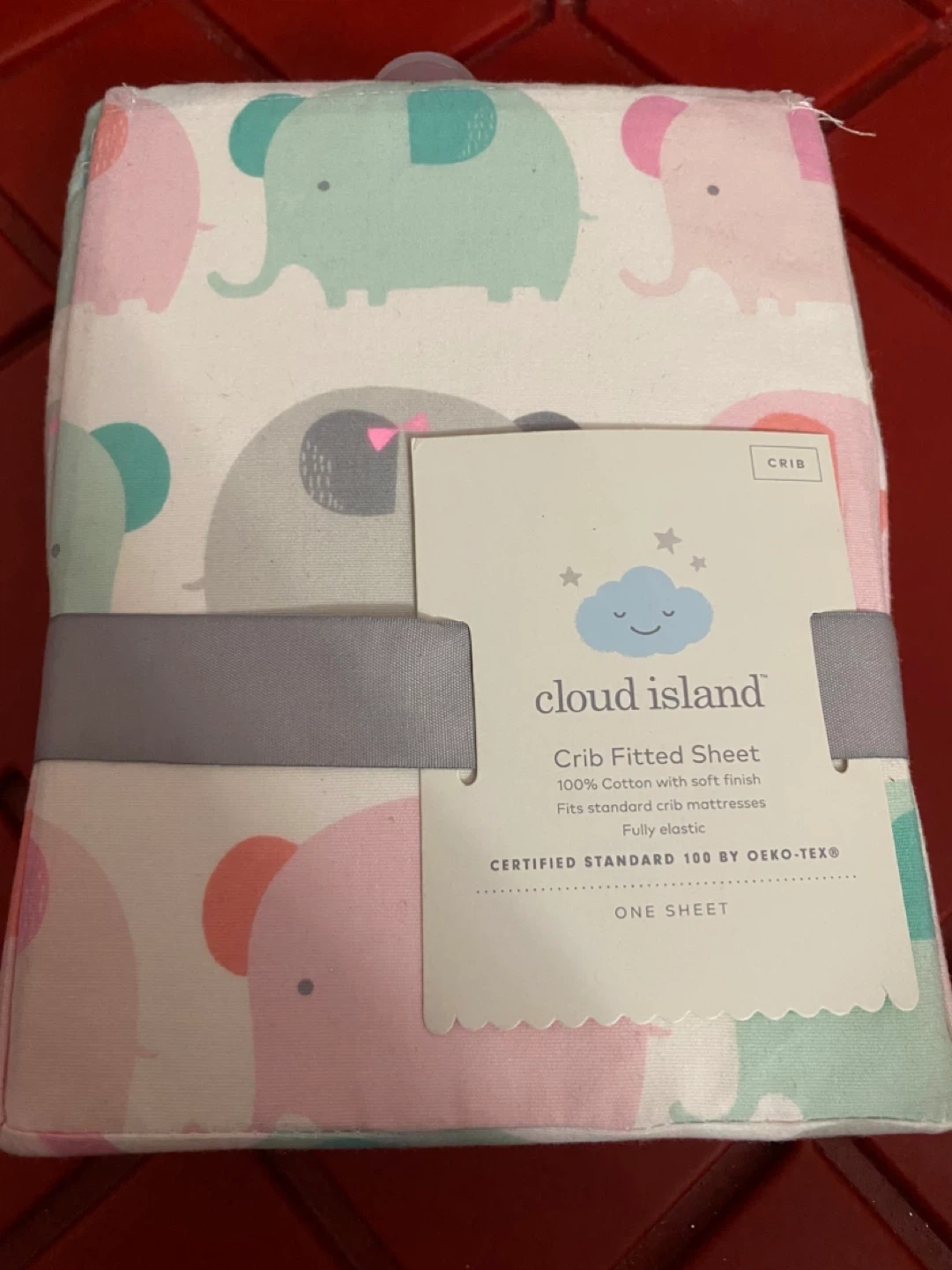 This Cloud Island crib fitted sheet is made of 100% cotton with a soft finish. It fits standard crib mattresses and is fully elastic. It's OEKO-TEX certified and free from harmful chemicals. Measurements are 28 x 52 inches.