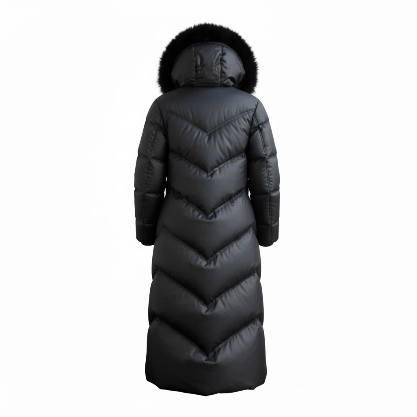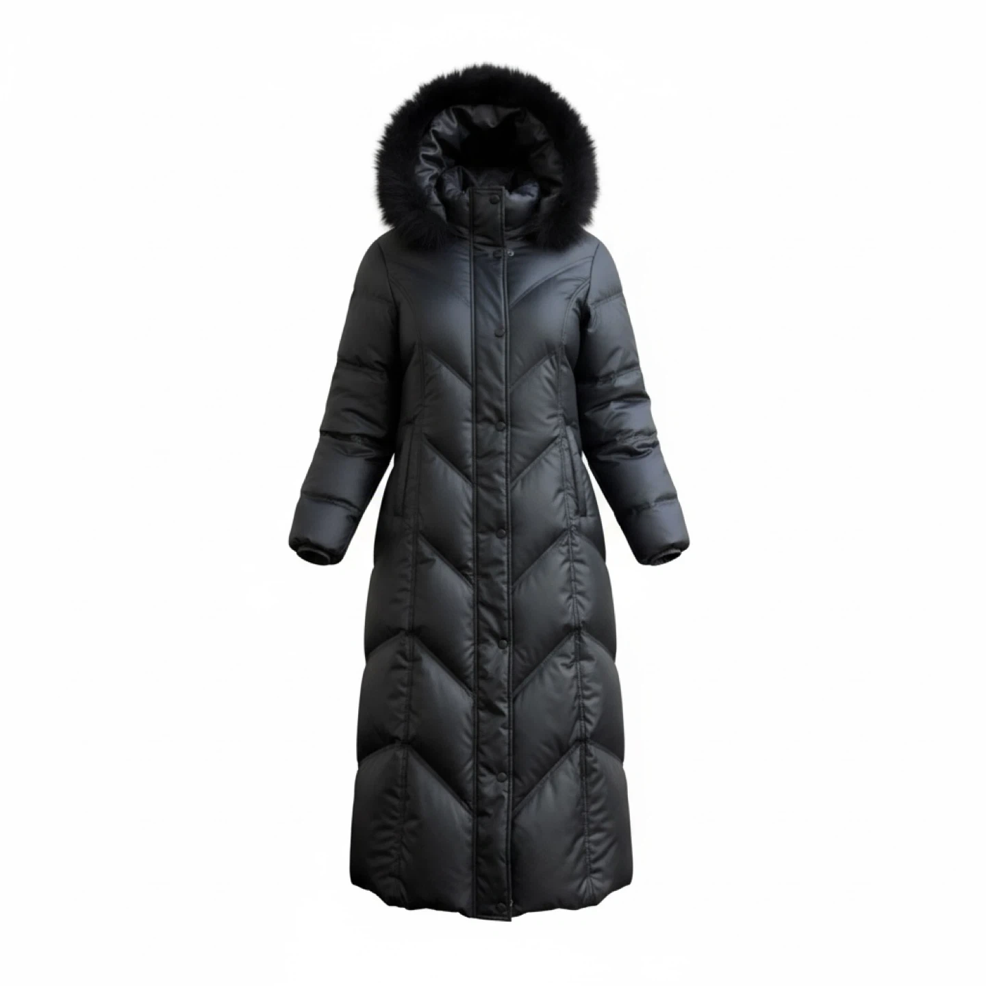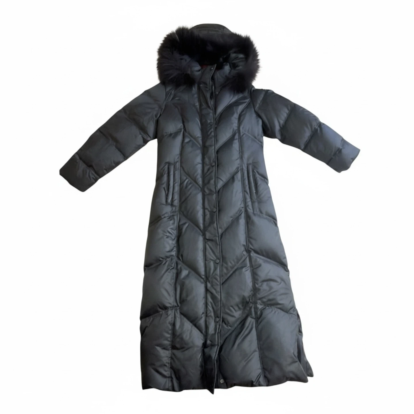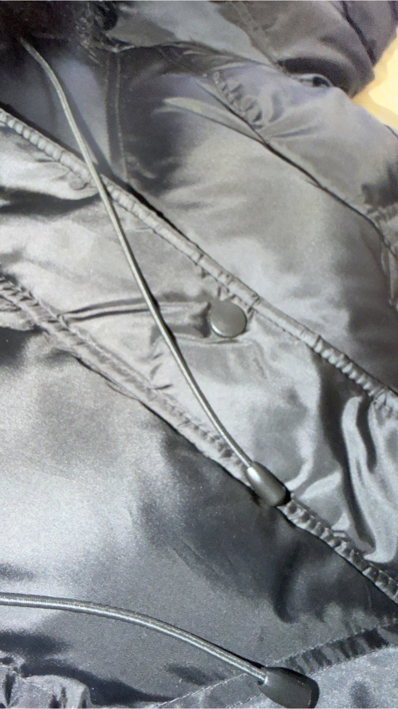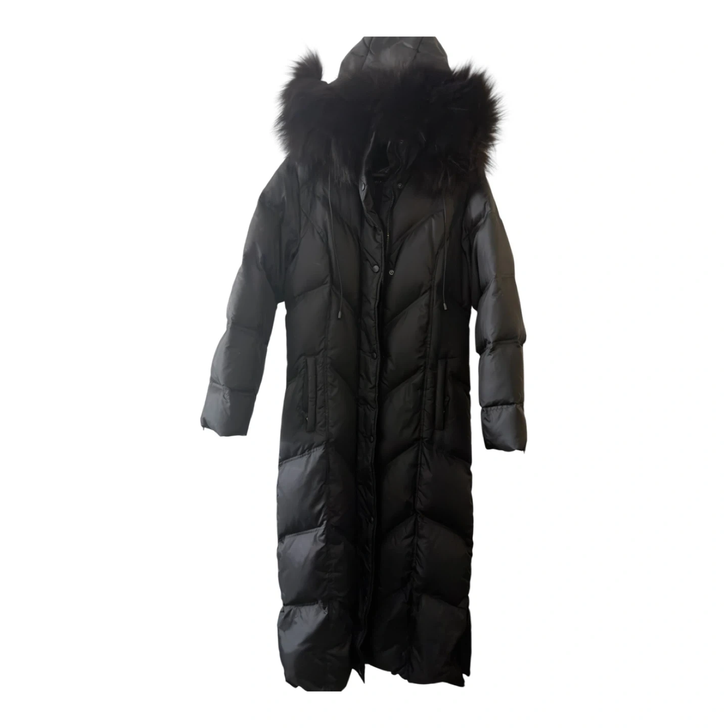 This is a long black puffer coat. It features a drawstring waist and a removable fur trim on the hood. It's warm and stylish for cold weather!