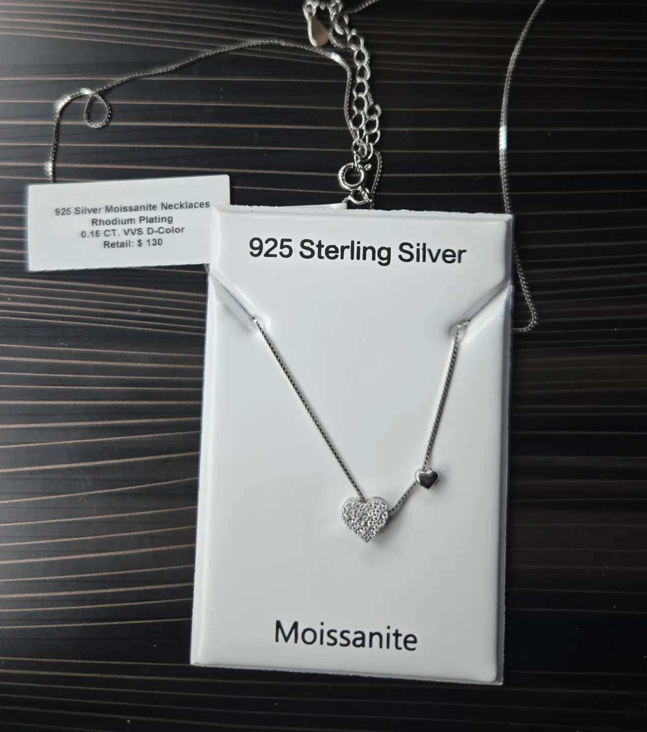 This is a beautiful Moissanite heart necklace made of 925 sterling silver with rhodium plating. It features a 0.16 CT VVS D-Color stone. It originally retailed for $130