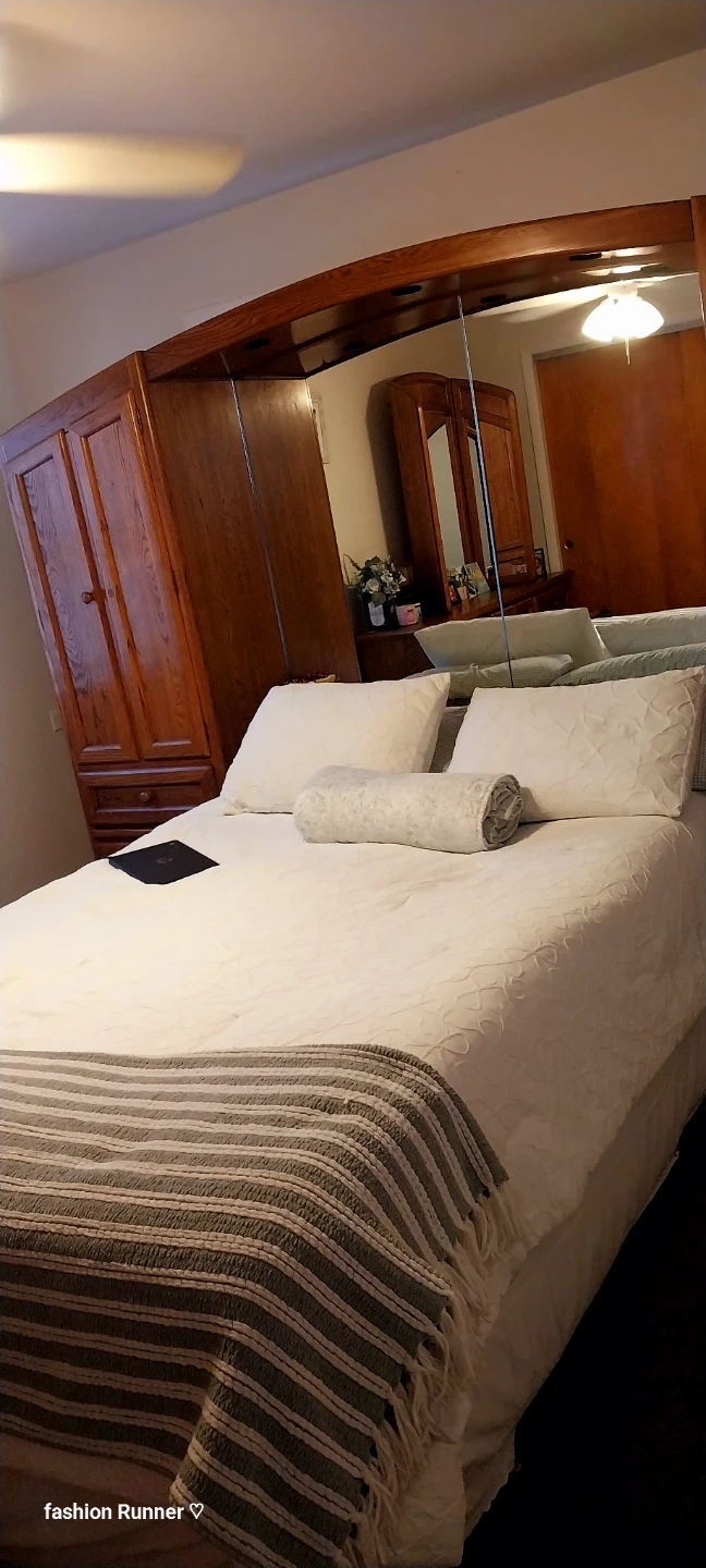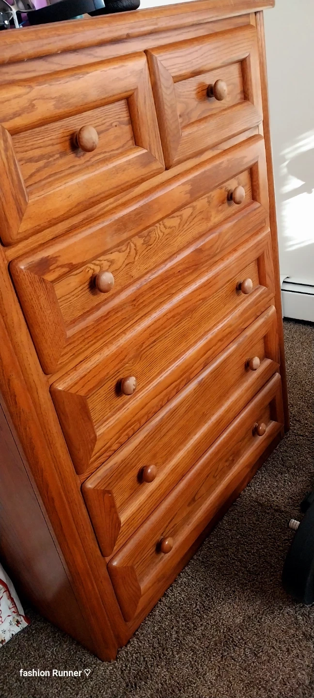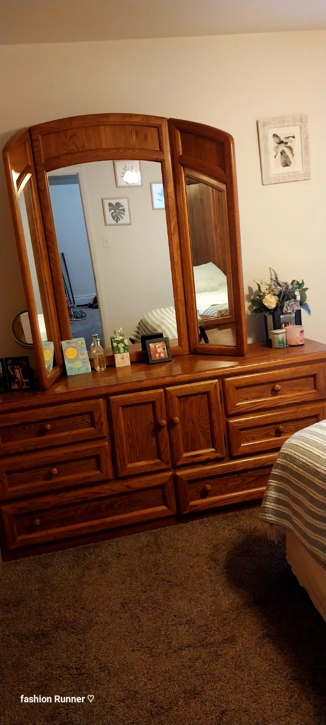 A sturdy dresser made of solid oak wood. It features multiple drawers for ample storage. The attached tri-fold mirror adds functionality to this bedroom piece.