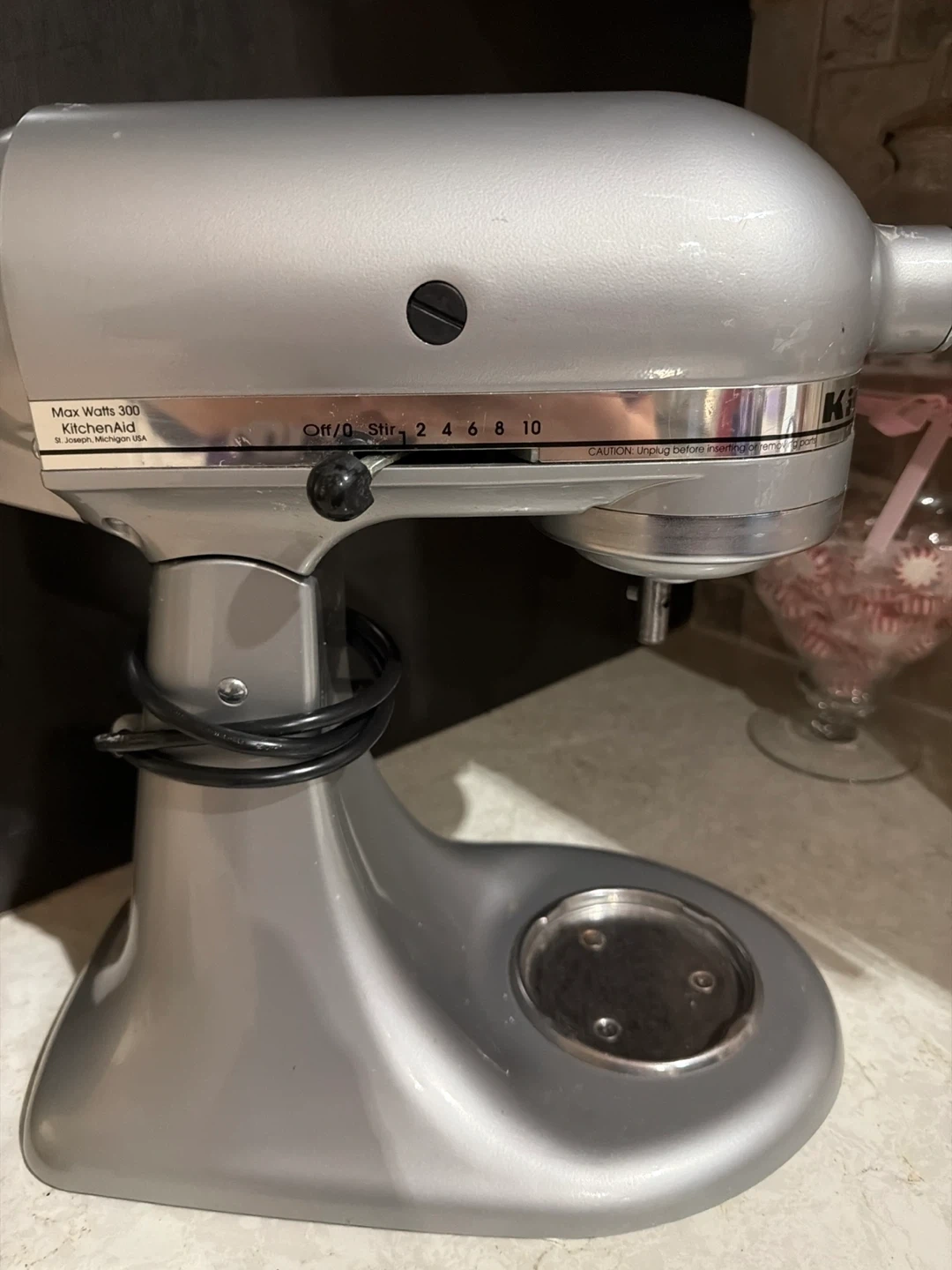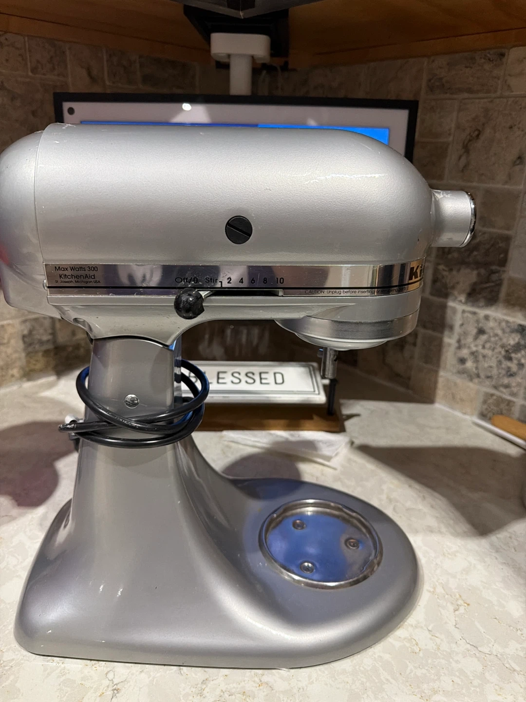 This is a silver KitchenAid stand mixer. It has 300 max watts. It features multiple speed settings for various mixing needs.