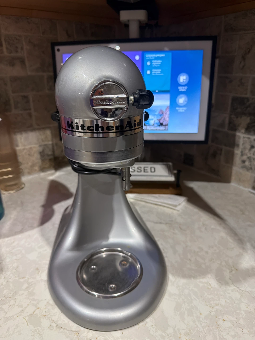 This is a silver KitchenAid stand mixer. It has 300 max watts. It features multiple speed settings for various mixing needs.