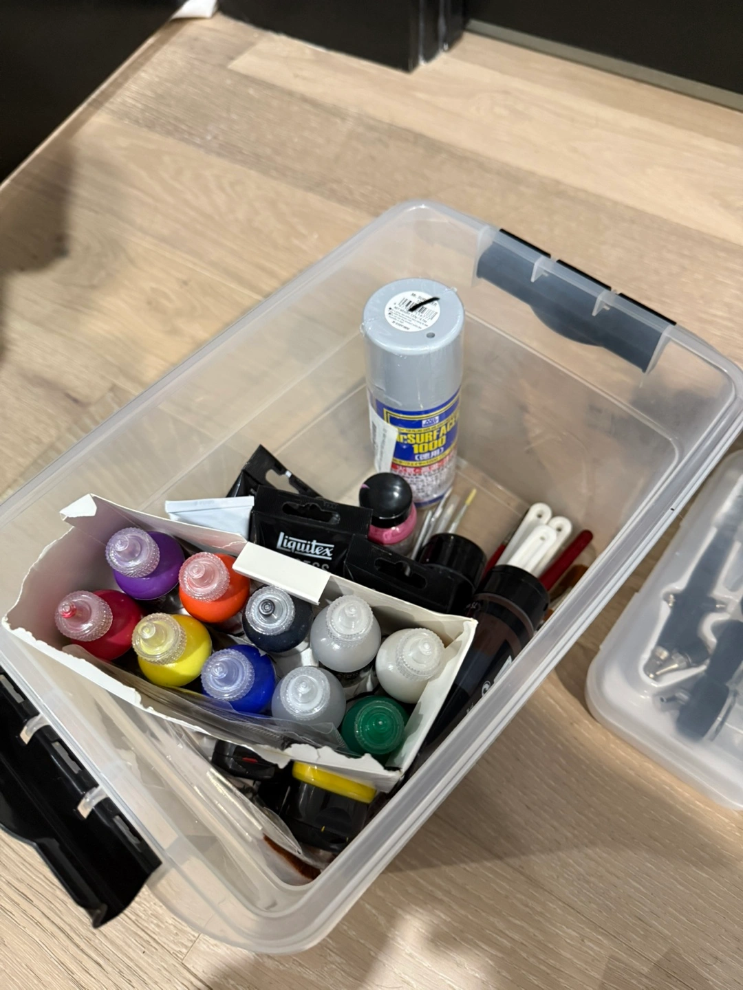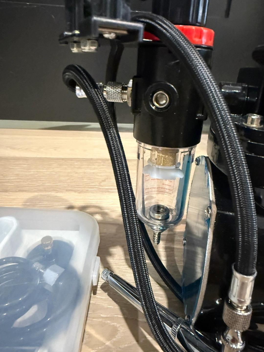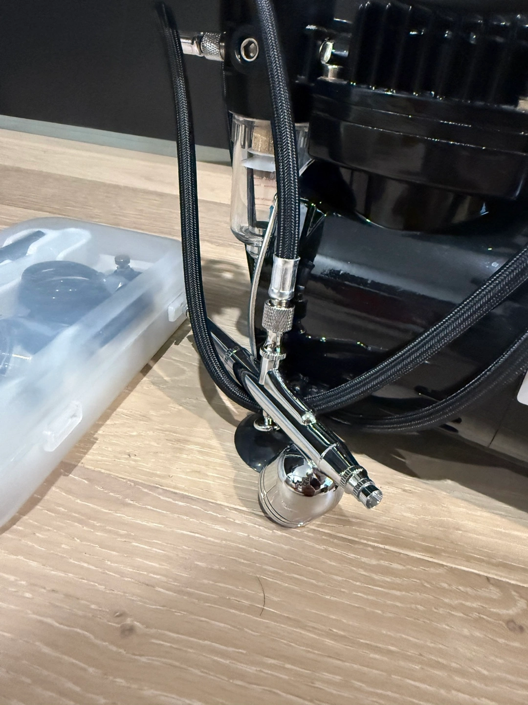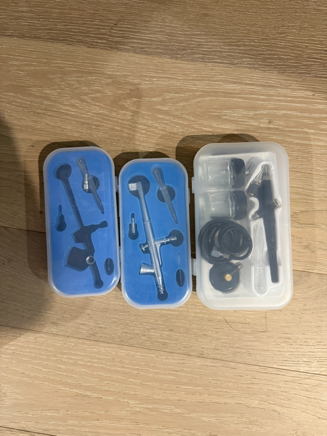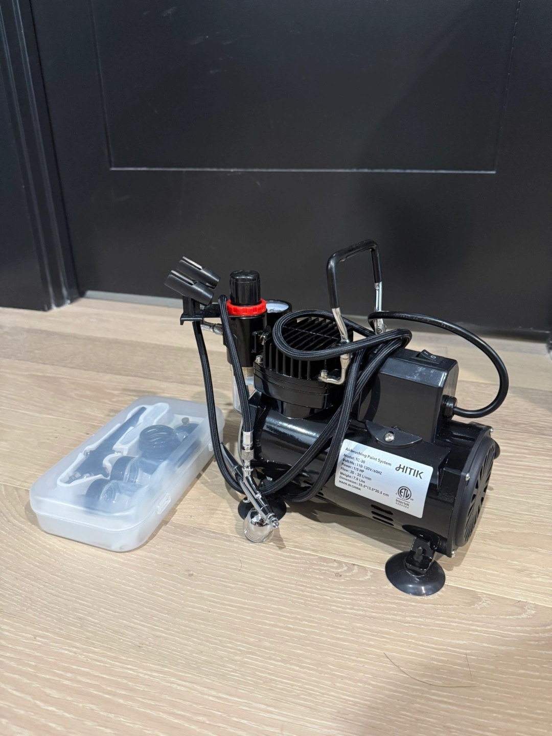 Airbrush compressor kit. Includes multiple airbrushes, hoses, and various paints. Great for models, crafts, or art. Included with Acrylic paints are from the brand 'Liquitex'.