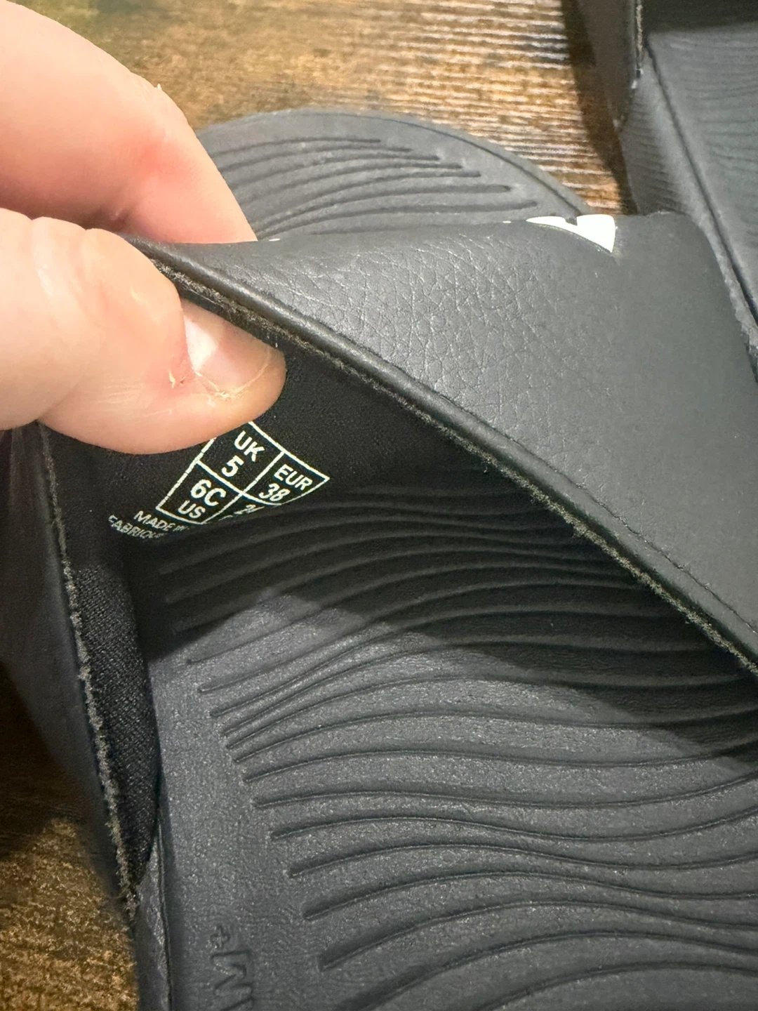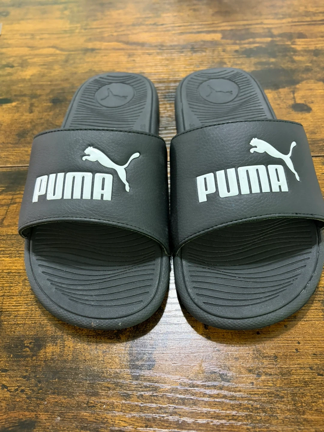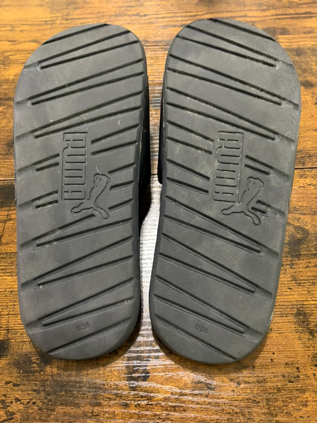 These are black Puma slide sandals. They are a US size 6C. The soles have a textured grip pattern.in excellent condition can be for a boy or girl