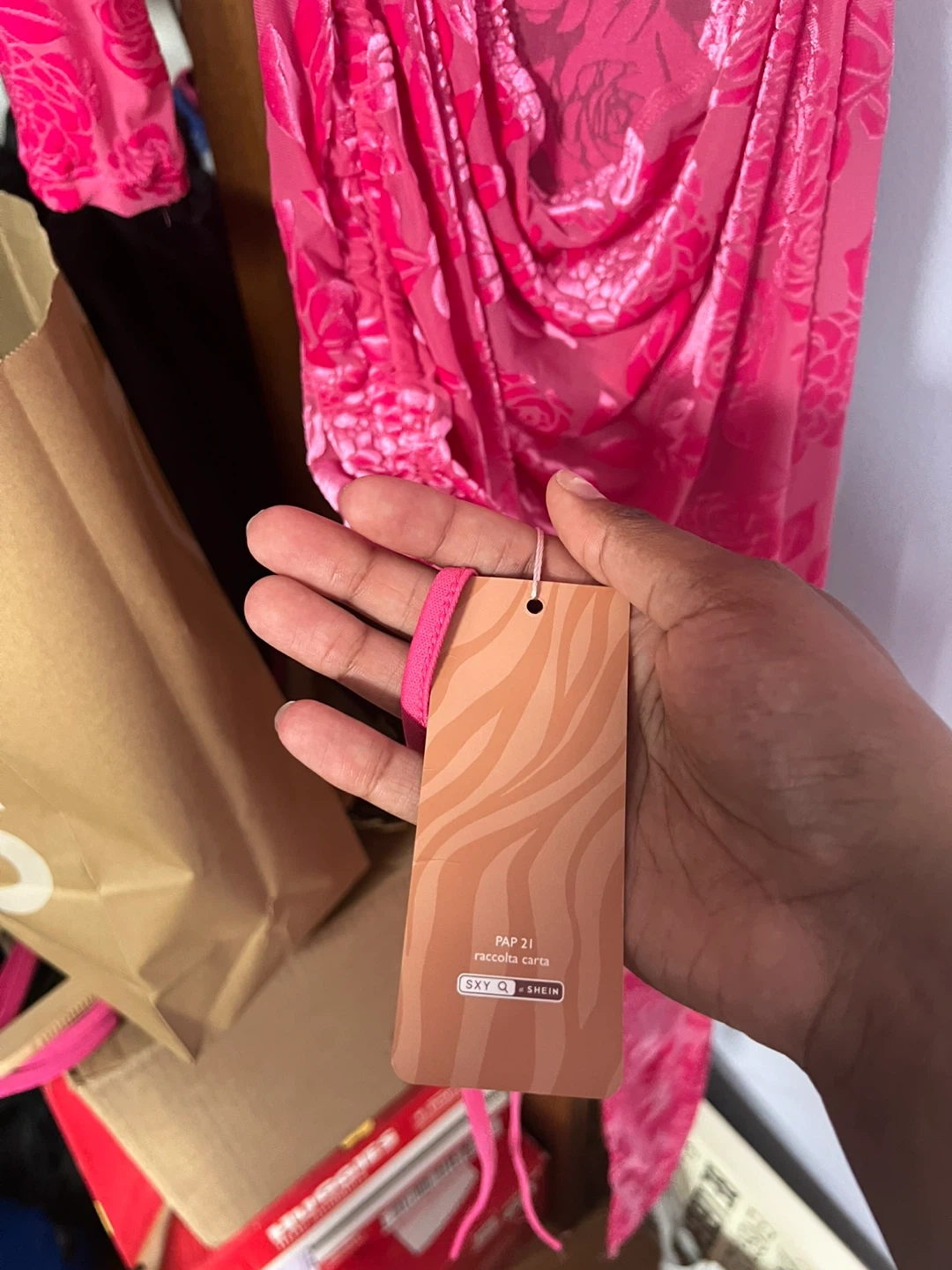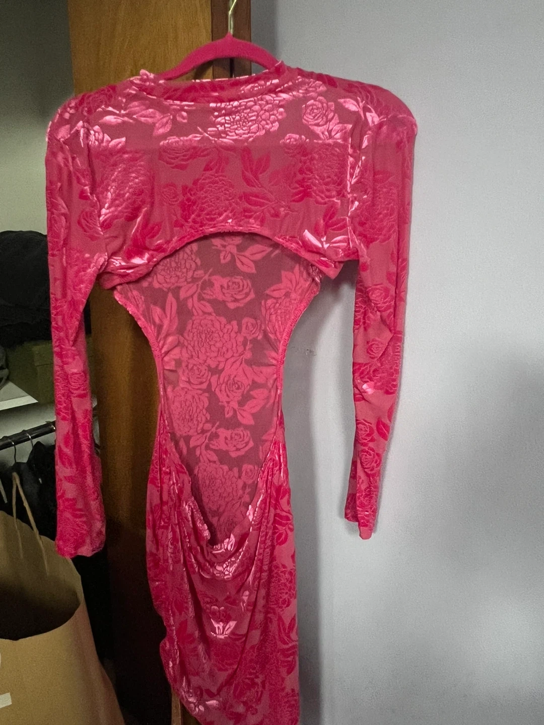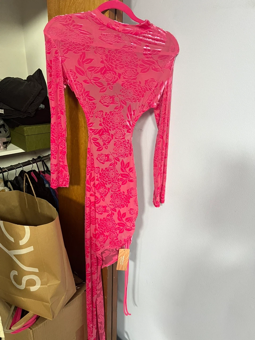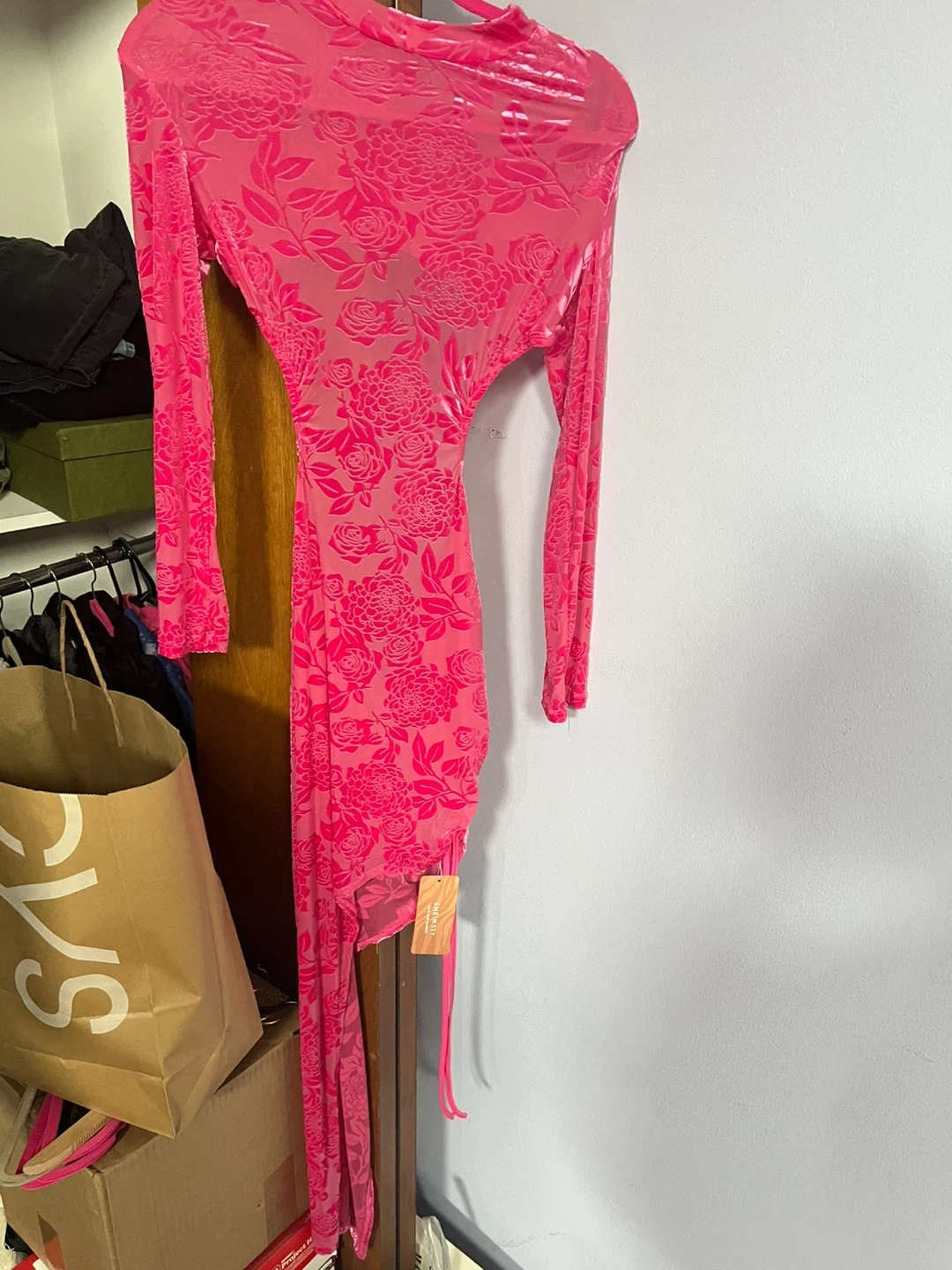 This is a SXY Q dress from Shein in a vibrant pink color with a floral pattern! It's a unique and stylish piece that's sure to turn heads