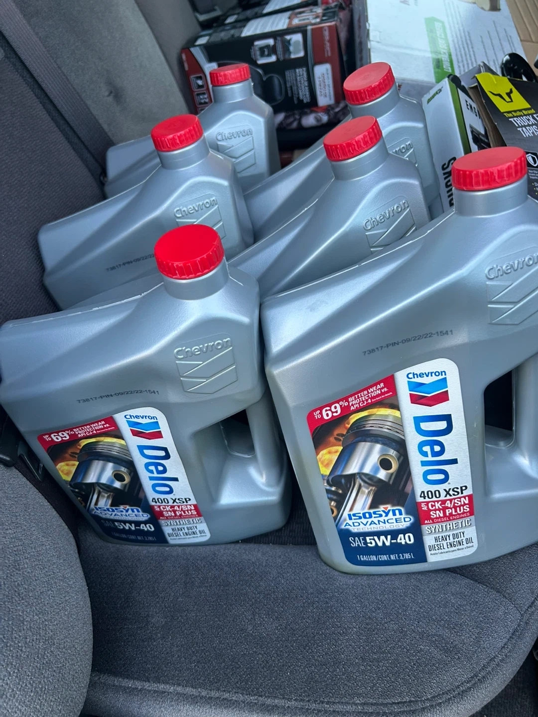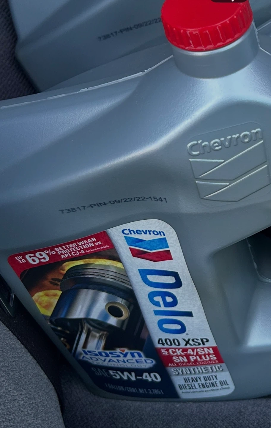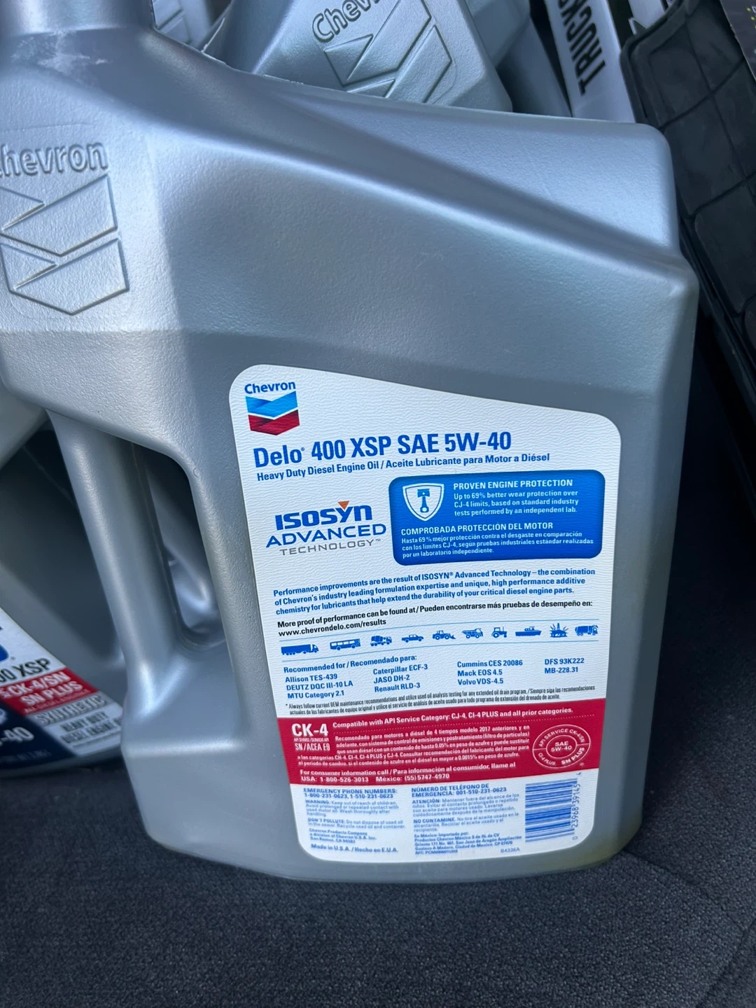 Chevron Delo 400 XSP SAE 5W-40 synthetic heavy duty diesel engine oil. ISOSYN Advanced Technology. Meets API CK-4/SN and other categories. 6 gallons available