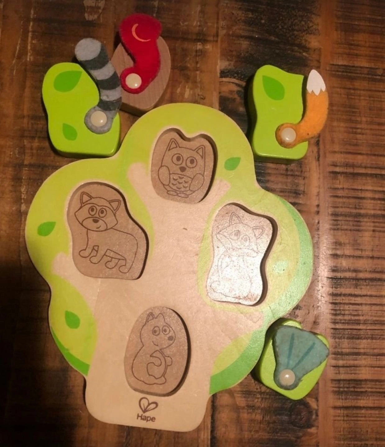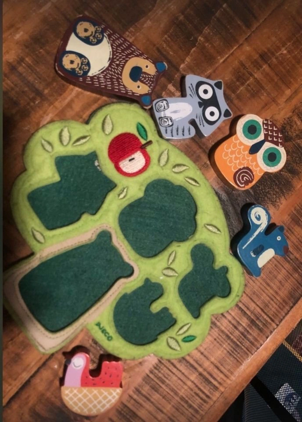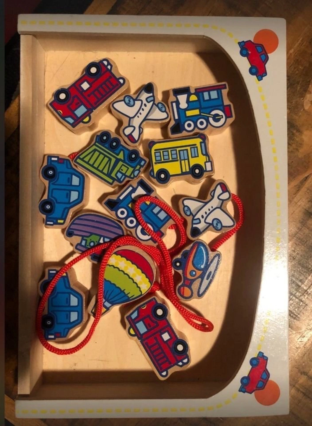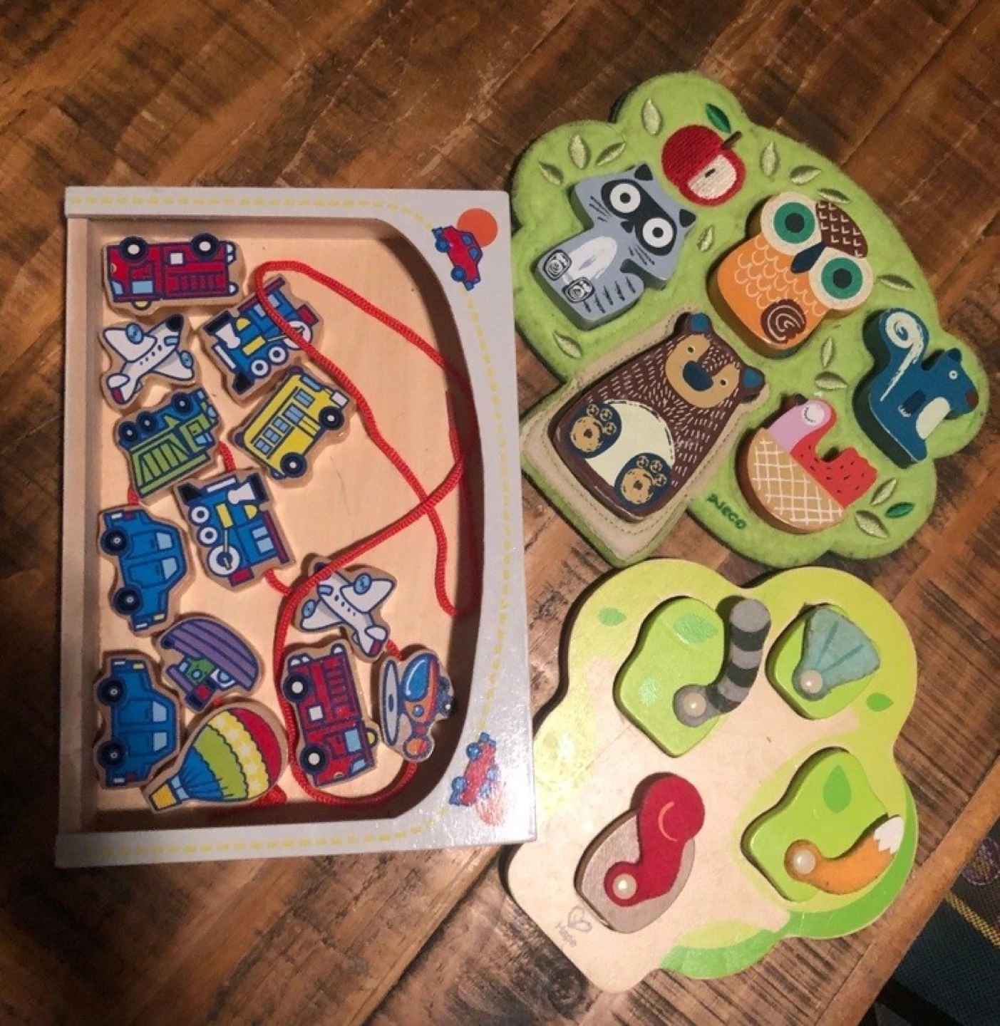 Set of three wooden puzzles. One features animals on a tree, another has vehicles, and the third is a lacing toy with various transportation modes. Great for toddlers and preschoolers. Includes all pieces.