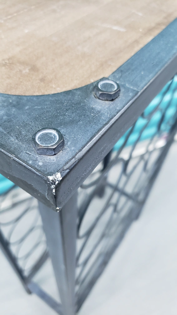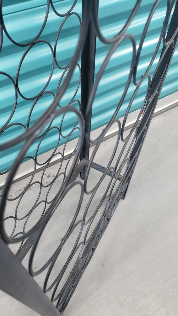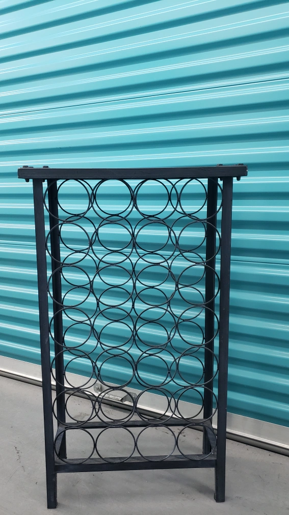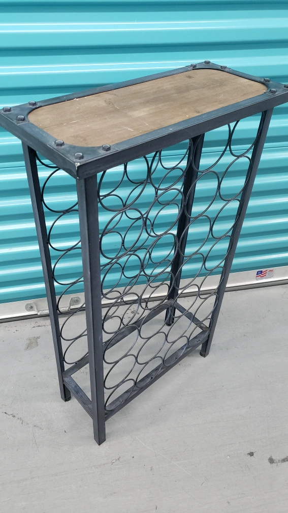 Here is a metal wine rack ready for a new home! It has a wooden top and holds about 30 bottles. It's in good condition and a great way to store your wine collection