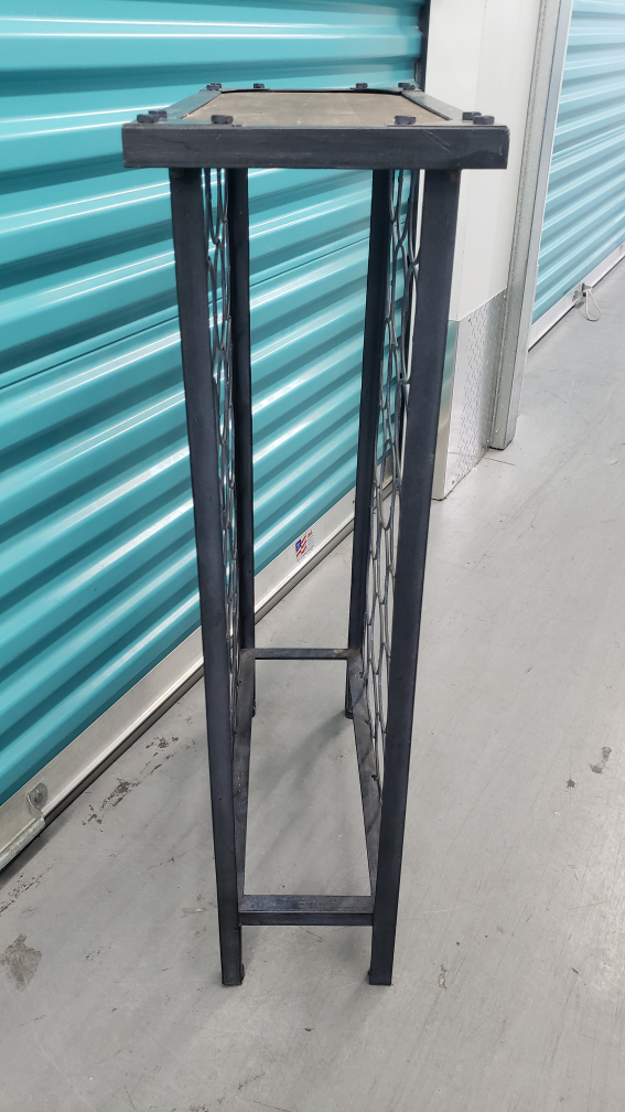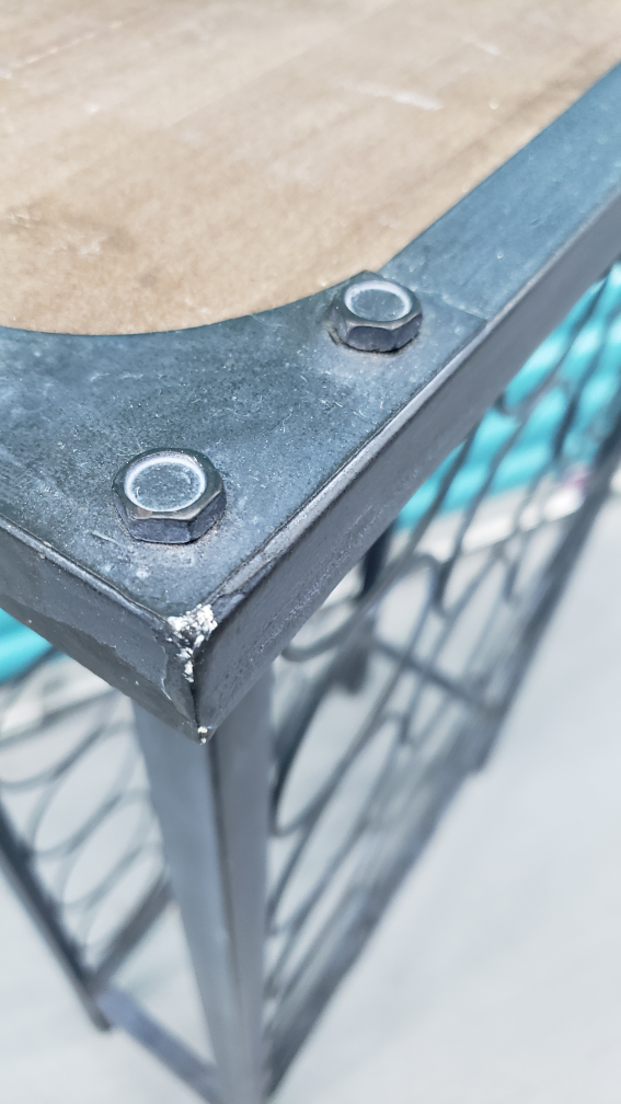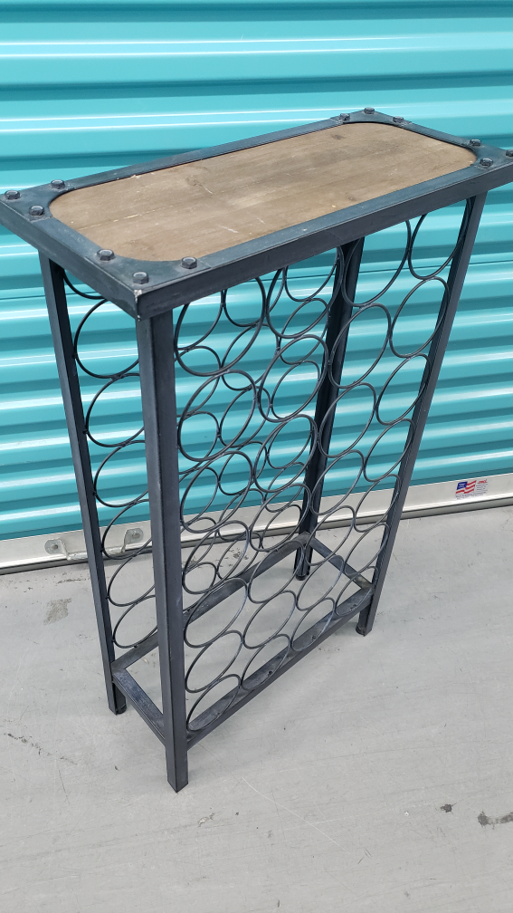 Here is a metal wine rack ready for a new home! It has a wooden top and holds about 30 bottles. It's in good condition and a great way to store your wine collection