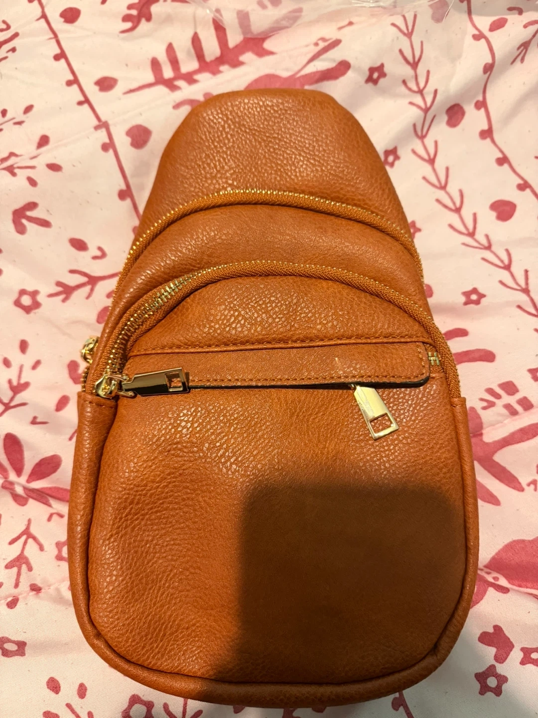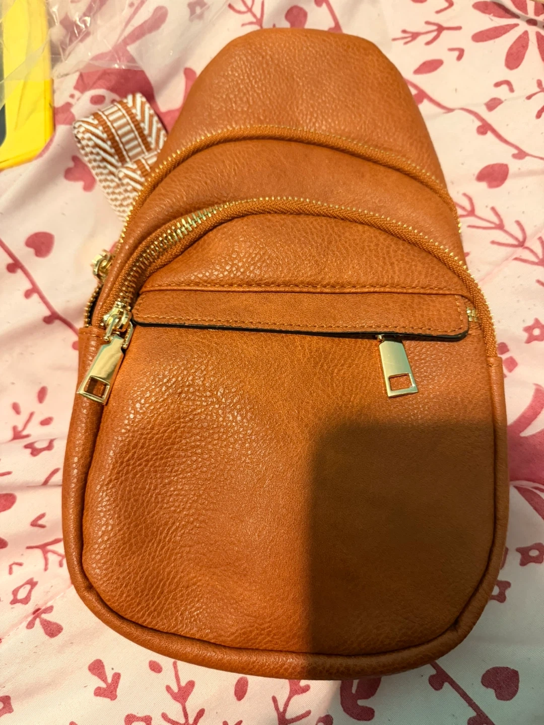 This brown sling backpack has a textured faux leather finish. It features a zip-around main compartment and a front zip pocket. The adjustable strap has a unique patterned design. It's great for everyday use!