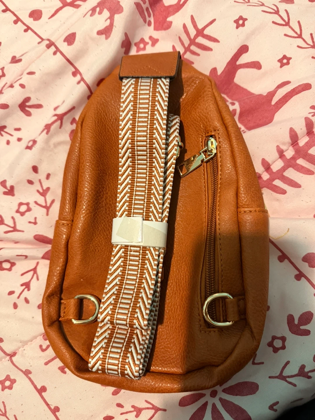 Brown Faux Leather Sling Backpack with Patterned Strap