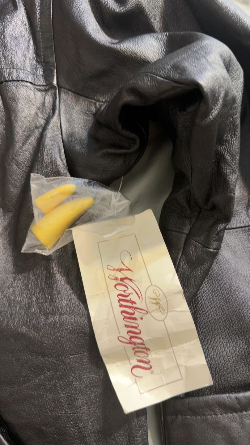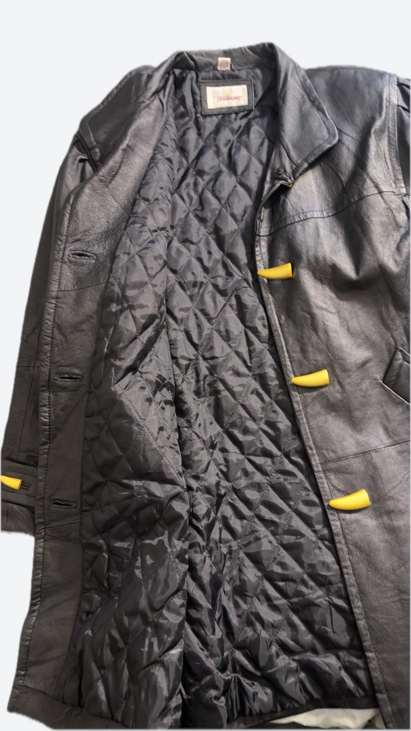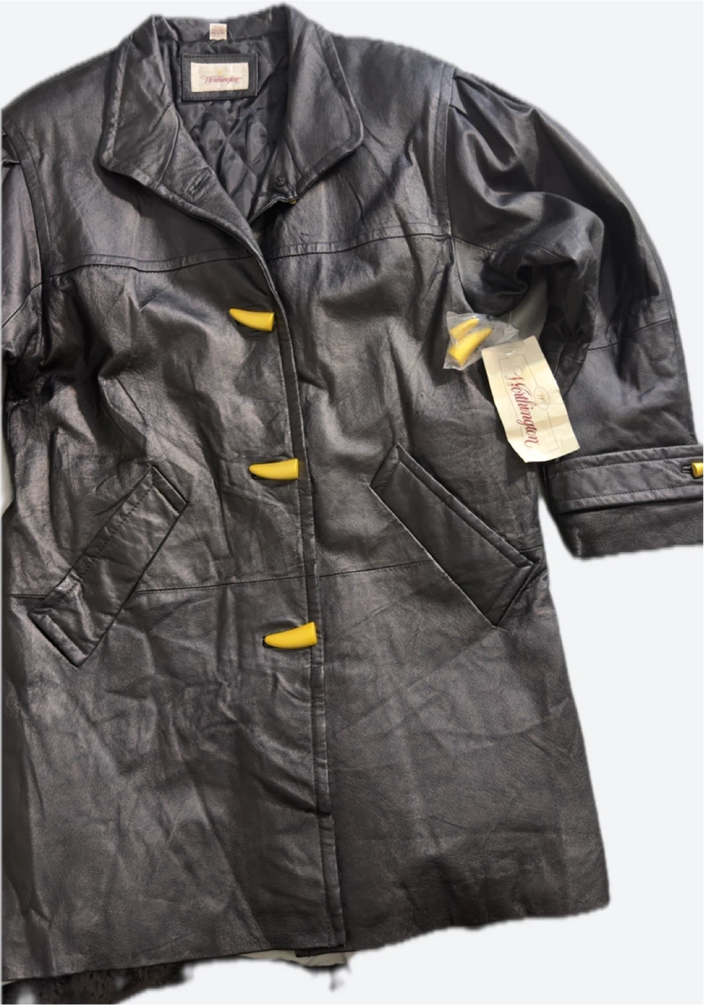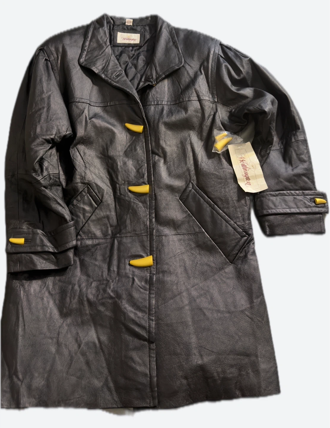 Classic black leather trench coat by Worthington. Features a quilted lining and unique yellow button details. Includes extra yellow accent pieces in original packaging.