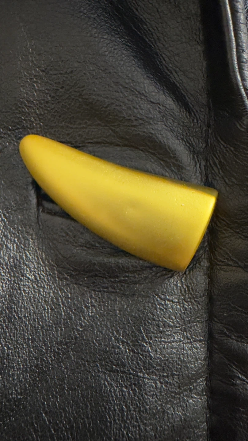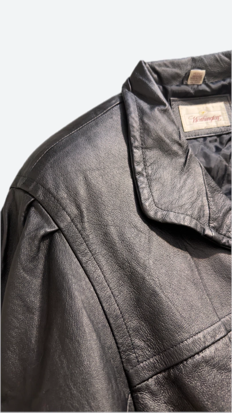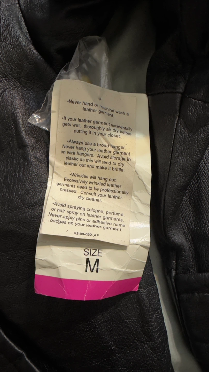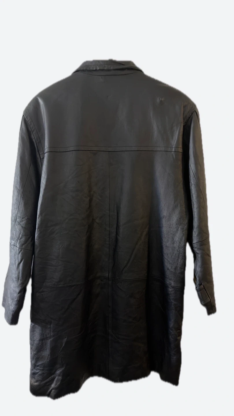 Classic black leather trench coat by Worthington. Features a quilted lining and unique yellow button details. Includes extra yellow accent pieces in original packaging.