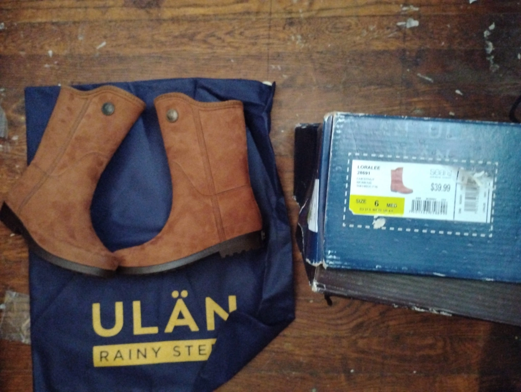 Show allA pair of tan colored boots. Medium height. Have a decorative button on the side. Come with a blue bag. Great for a rainy day walk. Comes with box. brand new never worn