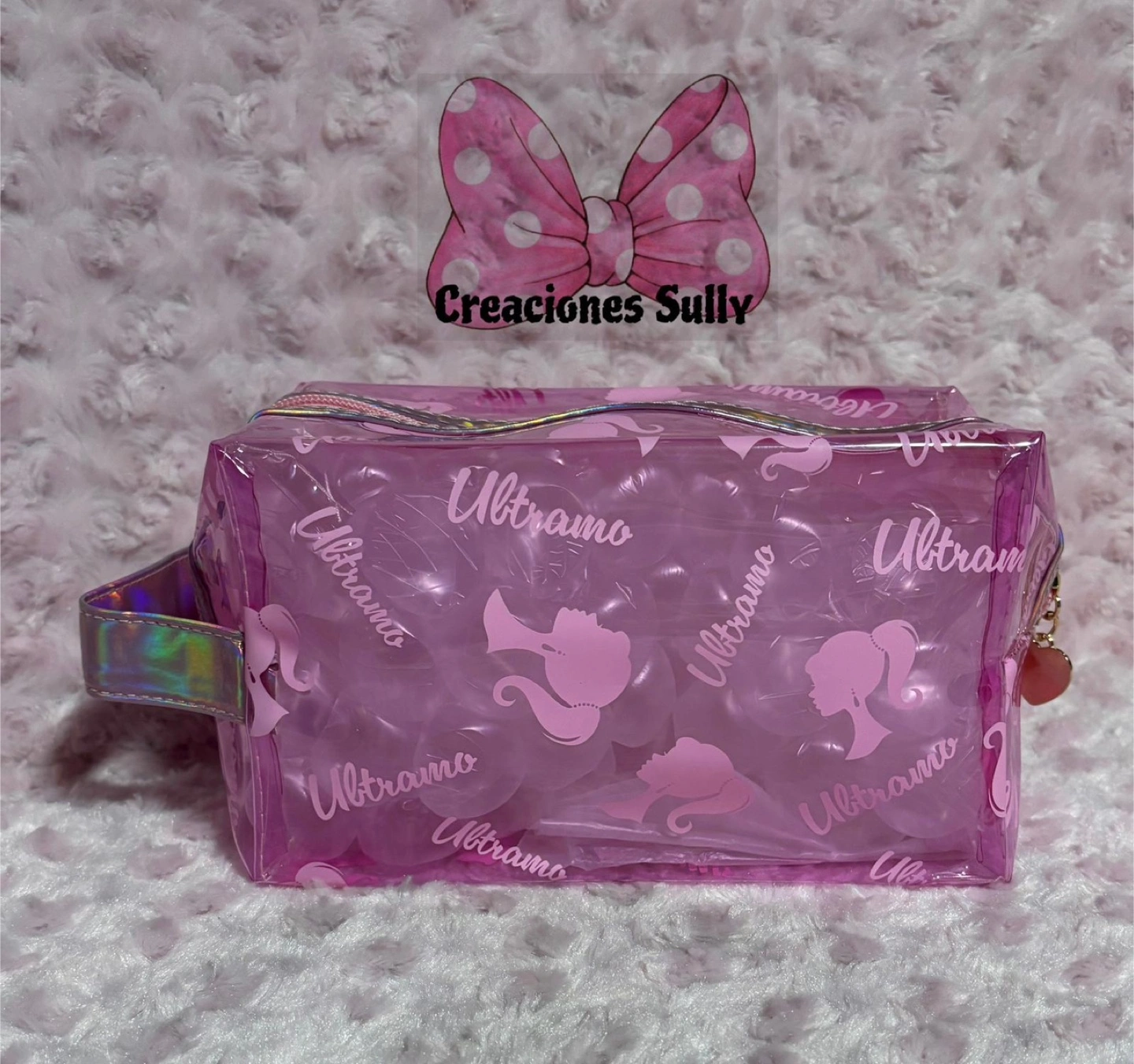 I'm selling a cute pink Ultramo cosmetic bag. It has a clear, see-through design with a fun pattern. Perfect for storing your makeup or toiletries!