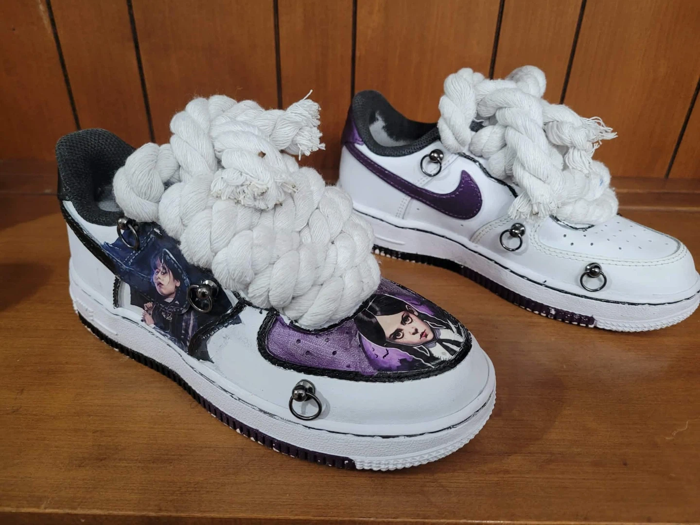 Check out these unique, custom Nike Air Force 1s! They feature a cool Adams Family “Wednesday" theme with a white base, purple accents, and rope laces. They're sure to turn heads!