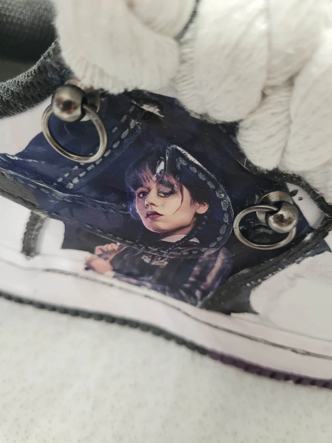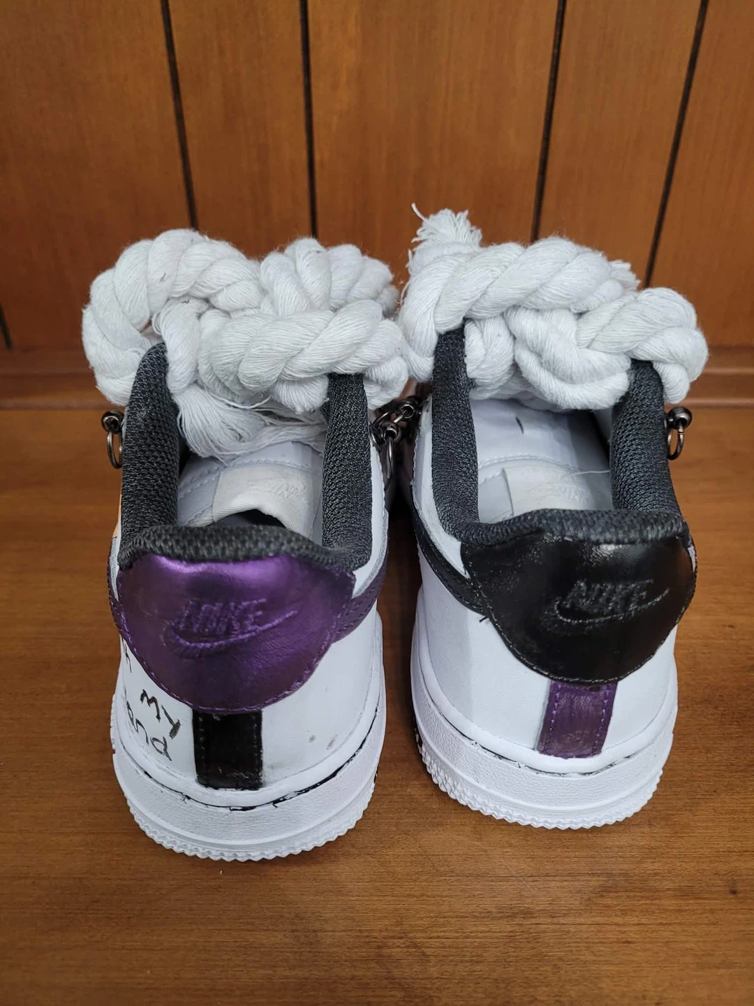 Check out these unique, custom Nike Air Force 1s! They feature a cool Adams Family “Wednesday" theme with a white base, purple accents, and rope laces. They're sure to turn heads!
