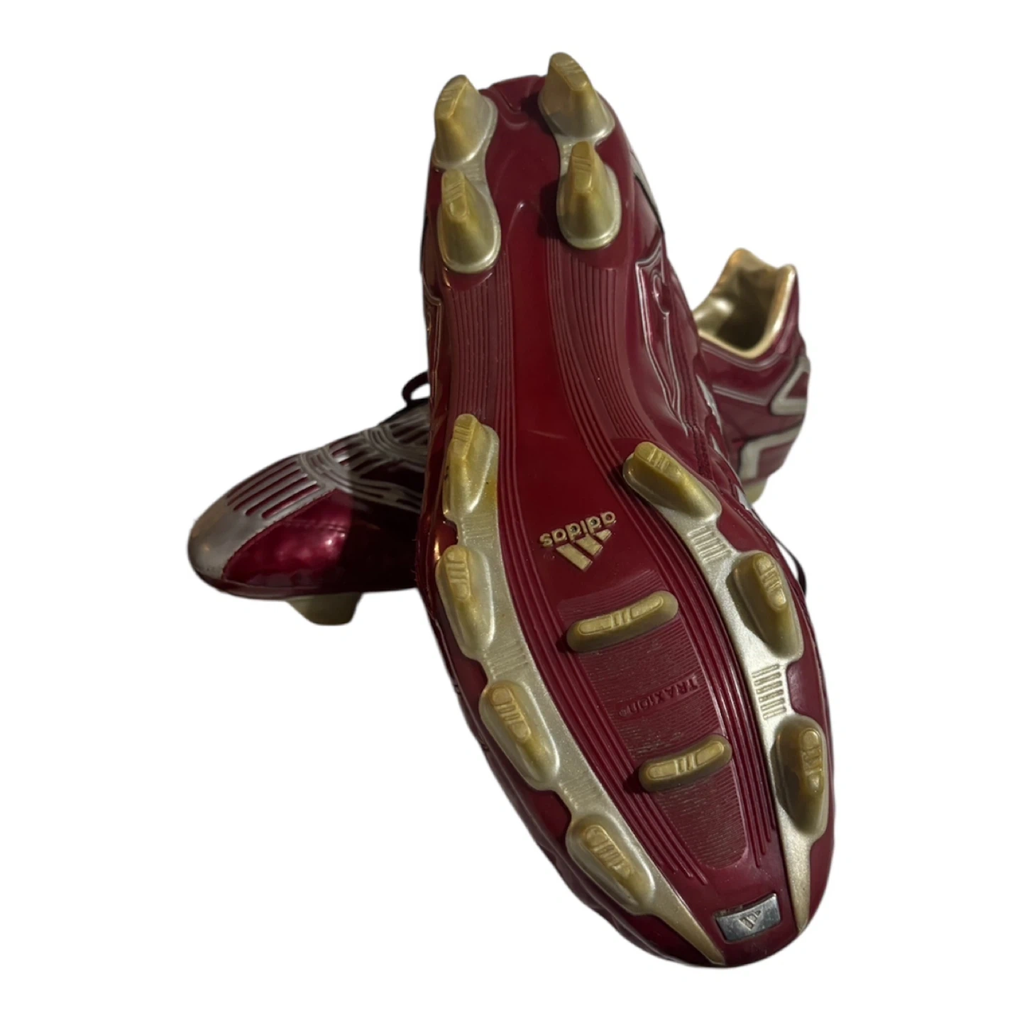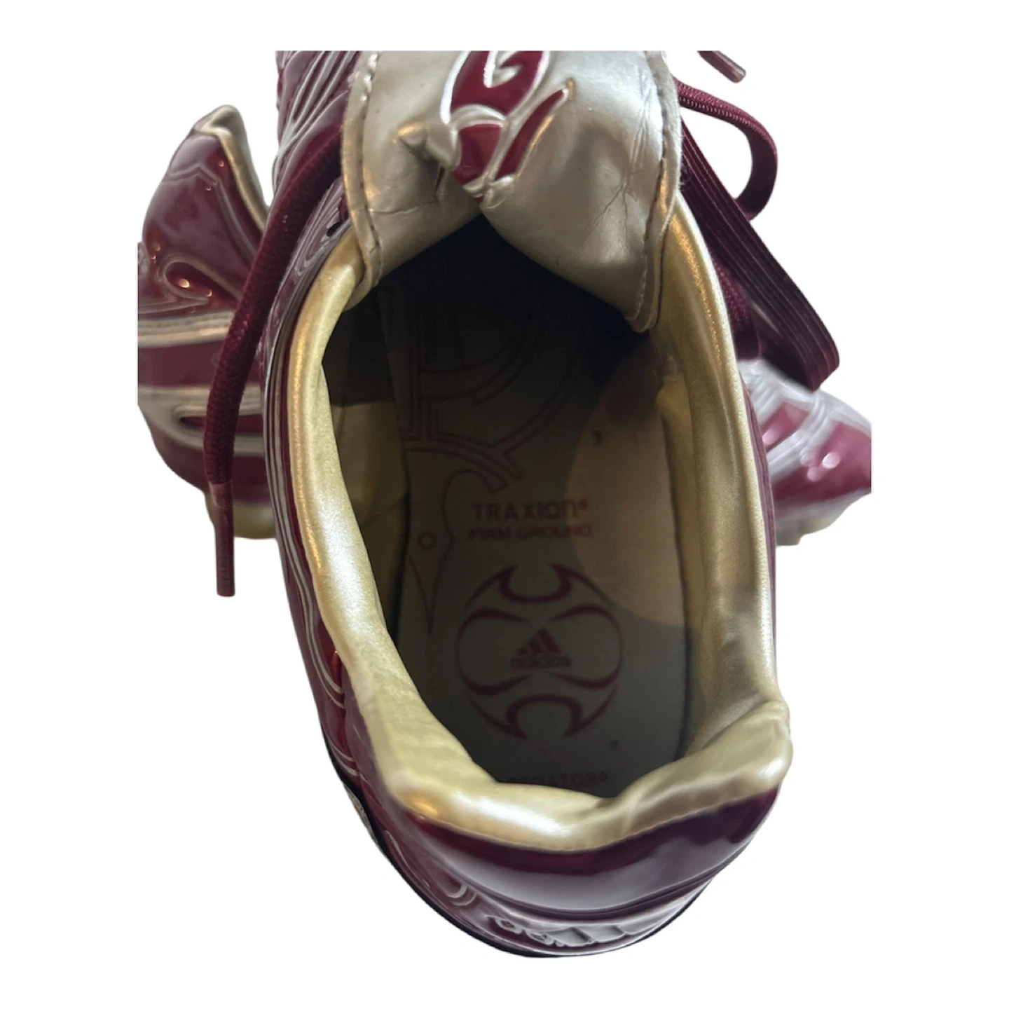 These Adidas soccer cleats are a rich burgundy with silver accents. They feature a Traxion outsole for excellent grip on the field. These shoes are designed for soccer performance.