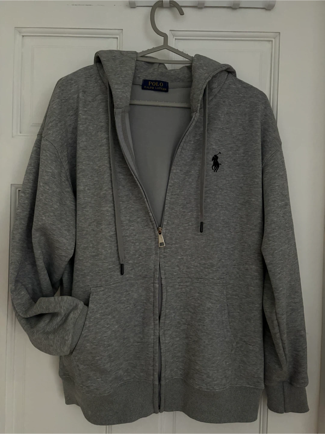 Grey zip-up hoodie by Polo Ralph Lauren. Features the signature polo player logo embroidered on the chest. Front pockets and a drawstring hood. Made from a soft cotton blend.