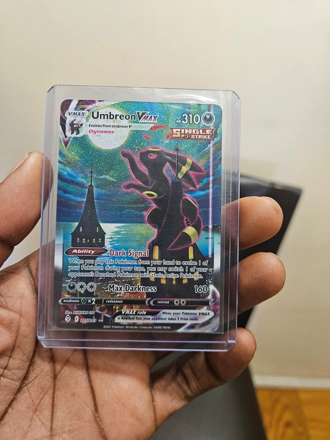 10Selling an Umbreon VMAX Pokemon card. Card is in great condition and ready for a new home! It evolves from Umbreon V and has the ability Dark Signal. It also has Max Darkness with 160. VMAX rule applies.