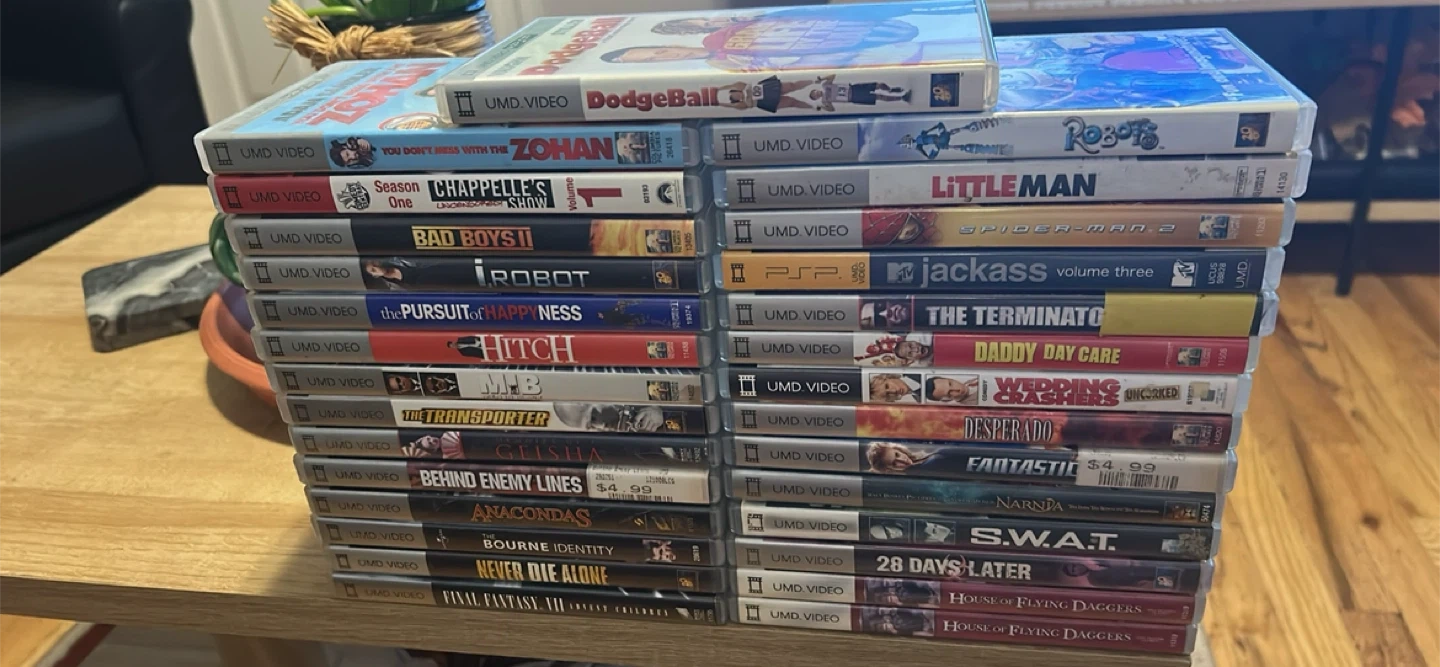 Selling a collection of UMD videos for PSP! Titles include: - Zohan - Chappelle's Show Season One - Bad Boys II - I, Robot - Hitch - MIB - The Transporter - Geisha - Behind Enemy Lines - Anacondas - Bourne Identity - Never Die Alone - Final Fantasy VII - Dodgeball - Robots - Little Man - Spider-Man 3 - Jackass Volume Three - The Terminator - Daddy Day Care - Wedding Uncorked - Desperado - Fantastic - S.W.A.T. - 28 Days Later - House of Flying Daggers All Different Prices