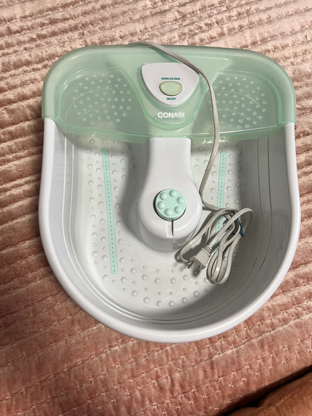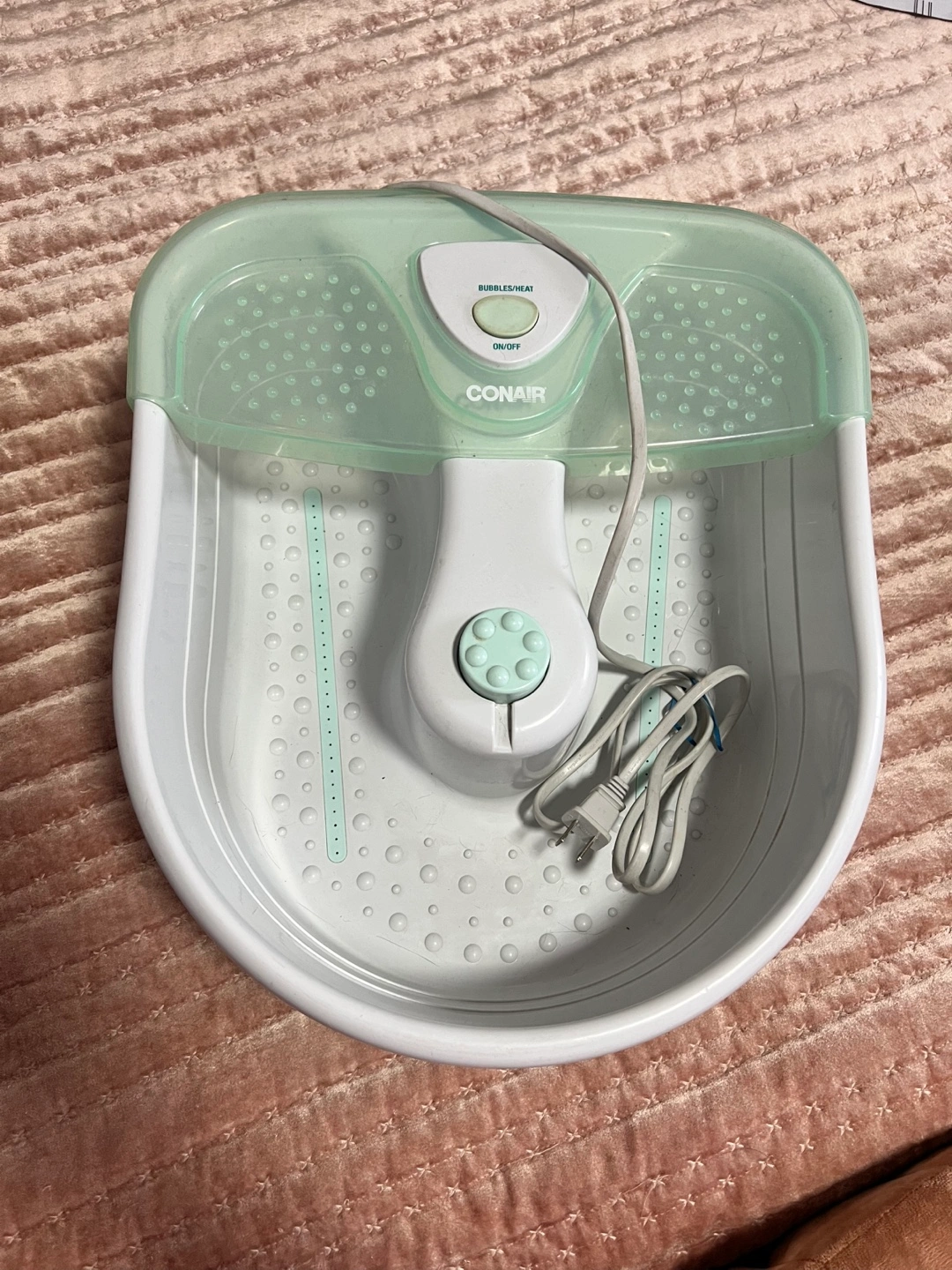 Foot spa with bubble and heat functions. Good condition, gently used. Includes power cord. Light teal and white.