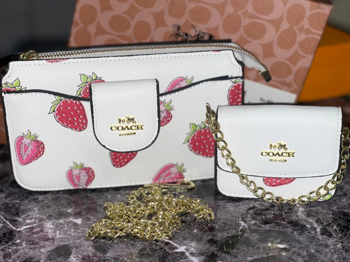 This is a set featuring a Coach wallet and a matching coin purse, both with a white base and a charming strawberry print. It includes a detachable gold chain. The material appears to be leather or a similar durable coating. This set is perfect for organizing small essentials.