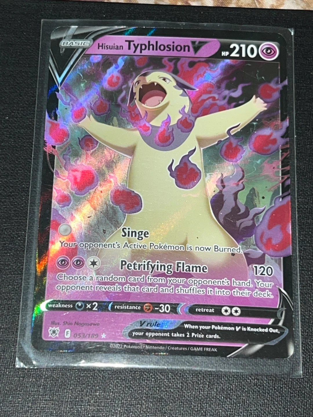 This is a Hisuian Typhlosion V Pokémon card. It features the 'Singe' and 'Petrifying Flame' attacks. The card has 210 HP and is from the 2022 Pokemon set.