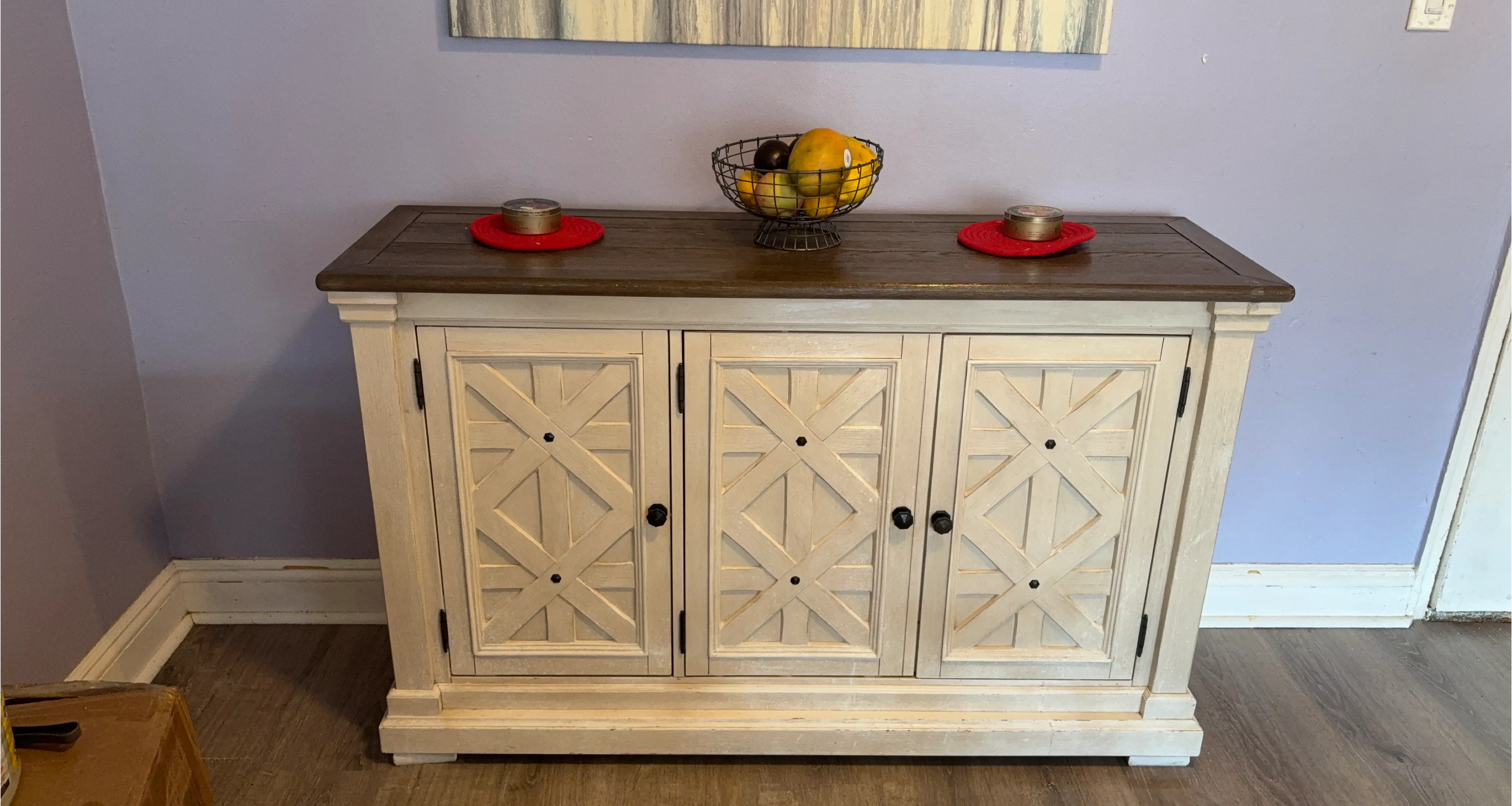Three-door accent cabinet with a distressed white finish and wood top. It features decorative criss-cross door panels and black hardware. Ample storage space inside for your home organization needs!