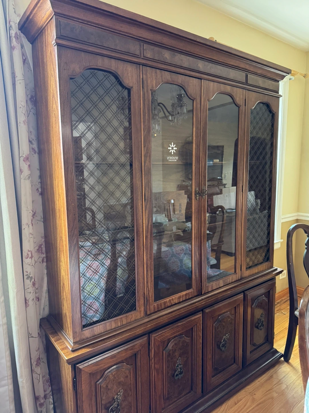 Selling a beautiful china cabinet by Unbound Furniture. It's in great condition and ready to add a touch of elegance to your dining room or living space! The cabinet features glass doors on the upper section and solid wood doors on the lower section, providing ample storage and display space.