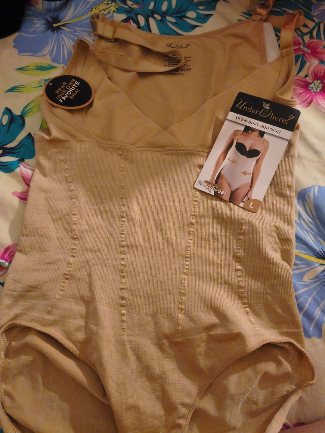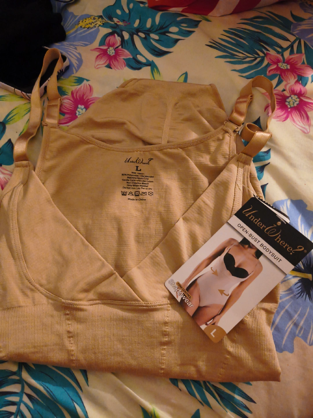 Selling a new Under Where? open-bust bodysuit in size L. It's a shapewear piece designed to wear under your favorite outfits. The material is a blend of 90% polyester and 10% spandex, offering a comfortable stretch. Perfect for creating a smooth silhouette!