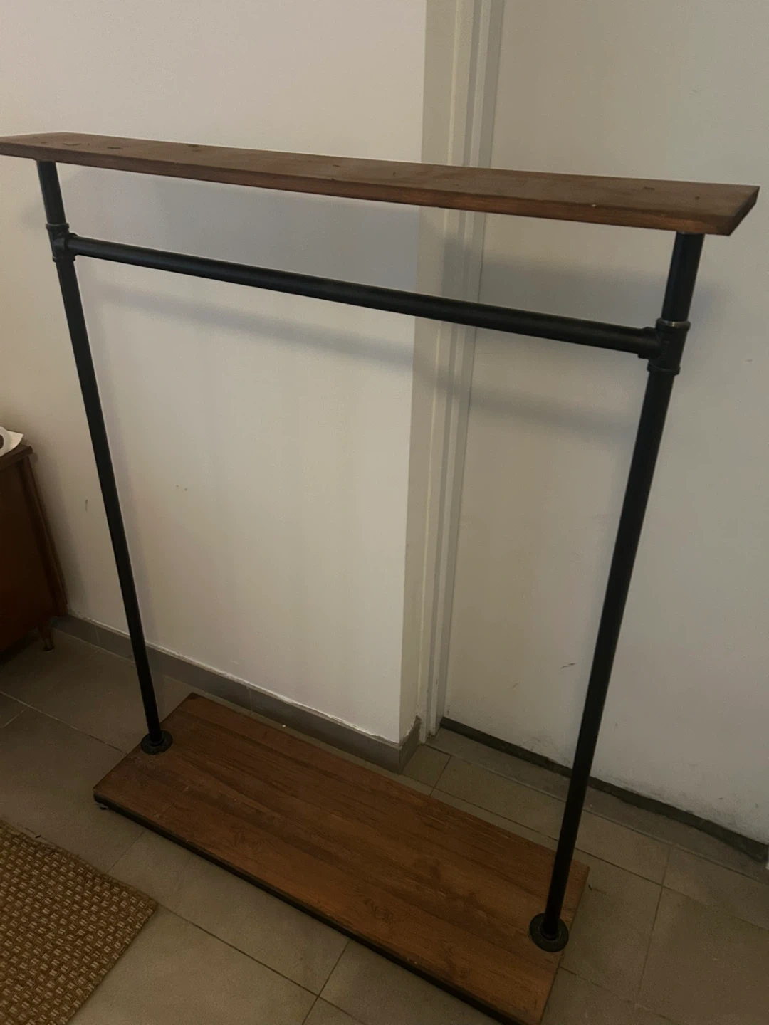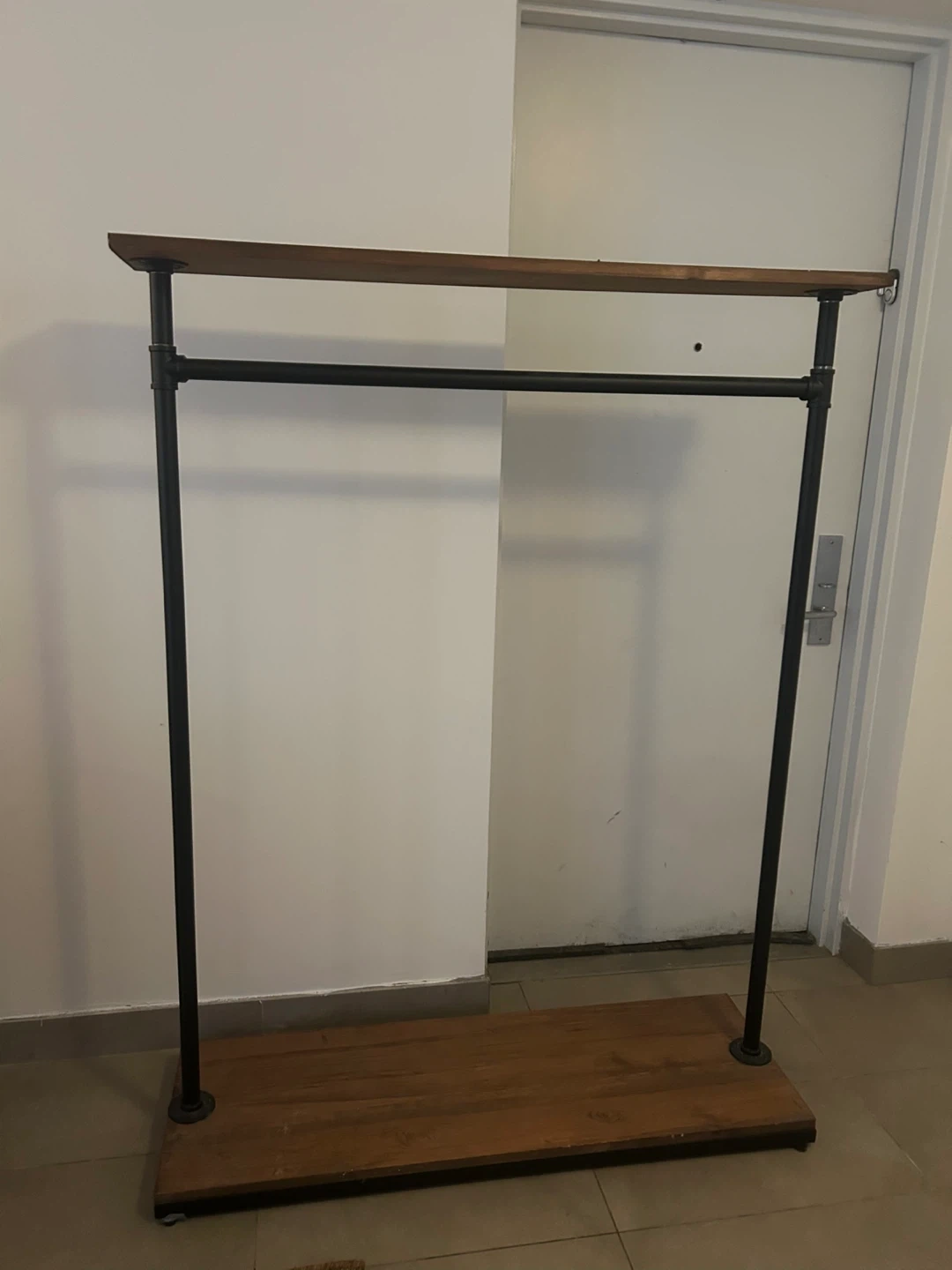 Selling a sturdy industrial style clothes rack. It features a wooden top and bottom shelf, connected by a black metal pipe frame. Great for adding a rustic touch to your closet or bedroom!