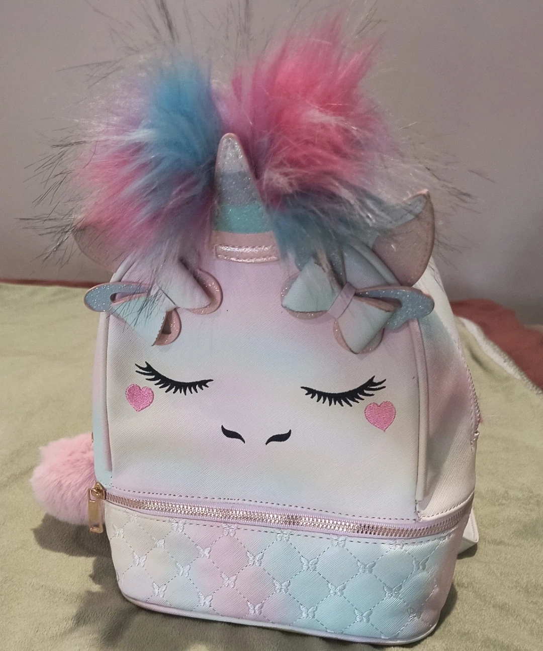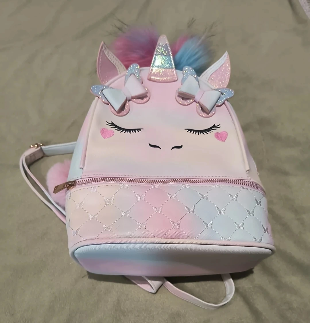 65This is a cute unicorn mini backpack! It features a pastel rainbow color scheme with a unicorn face design. It's perfect for kids or anyone who loves unicorns