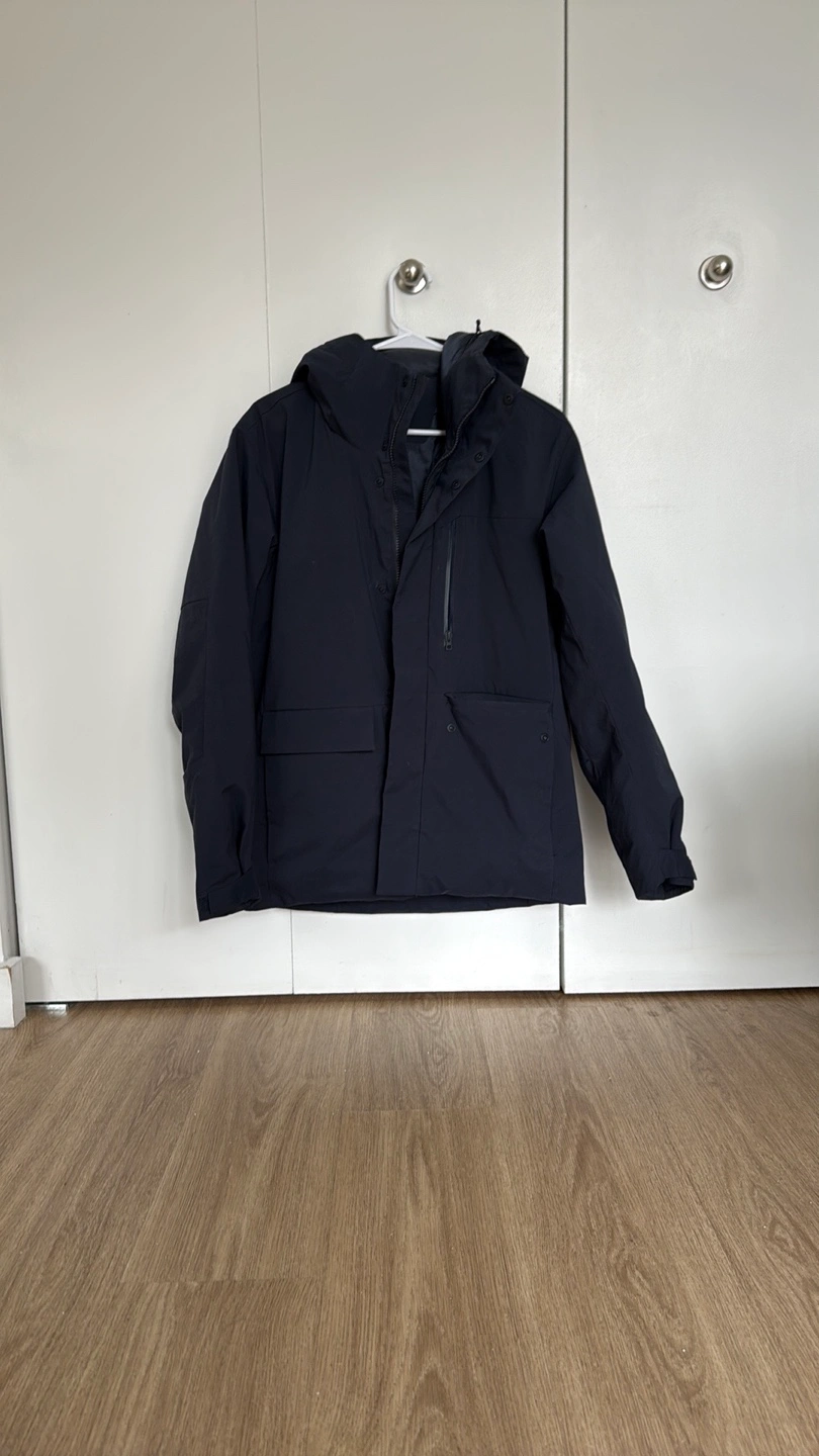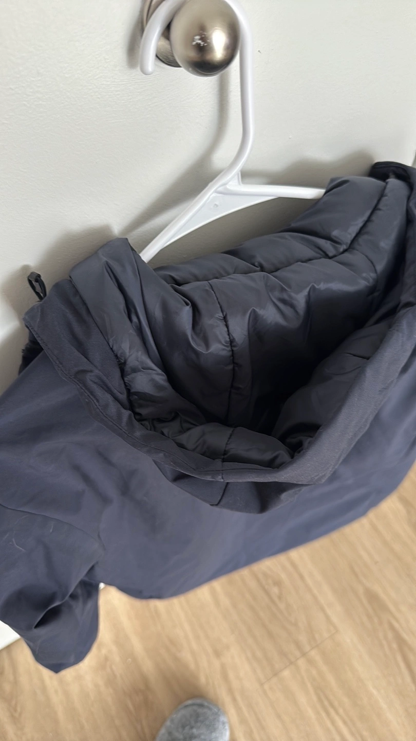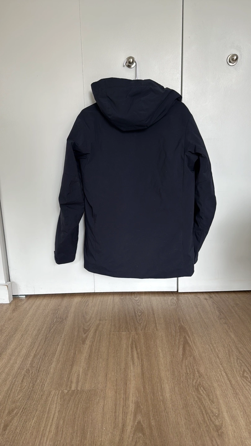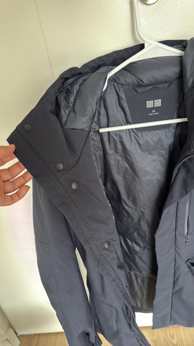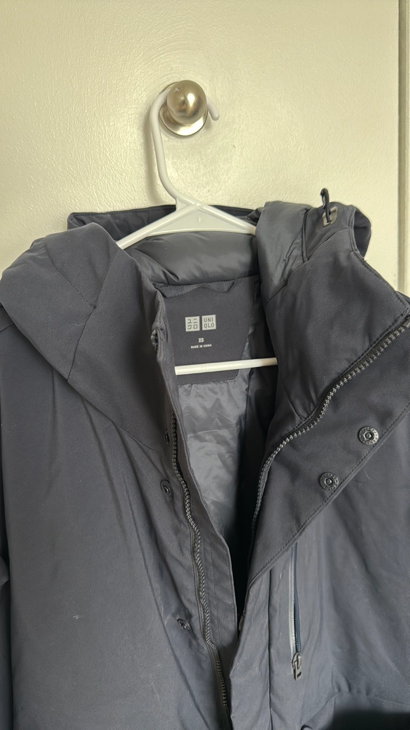 119Navy blue uniqlo jacket lightly worn. Will fit like a size small. I am 5’7 so it fits perfect.
