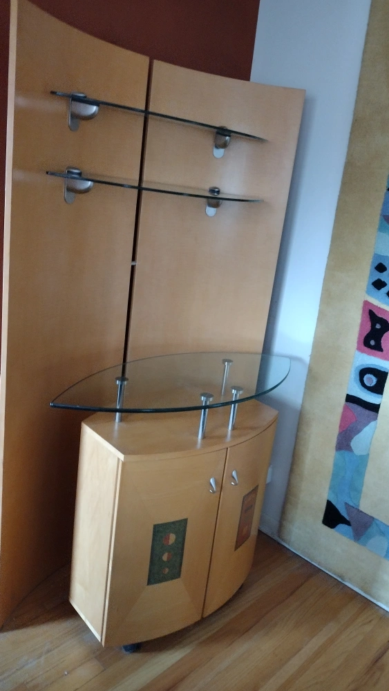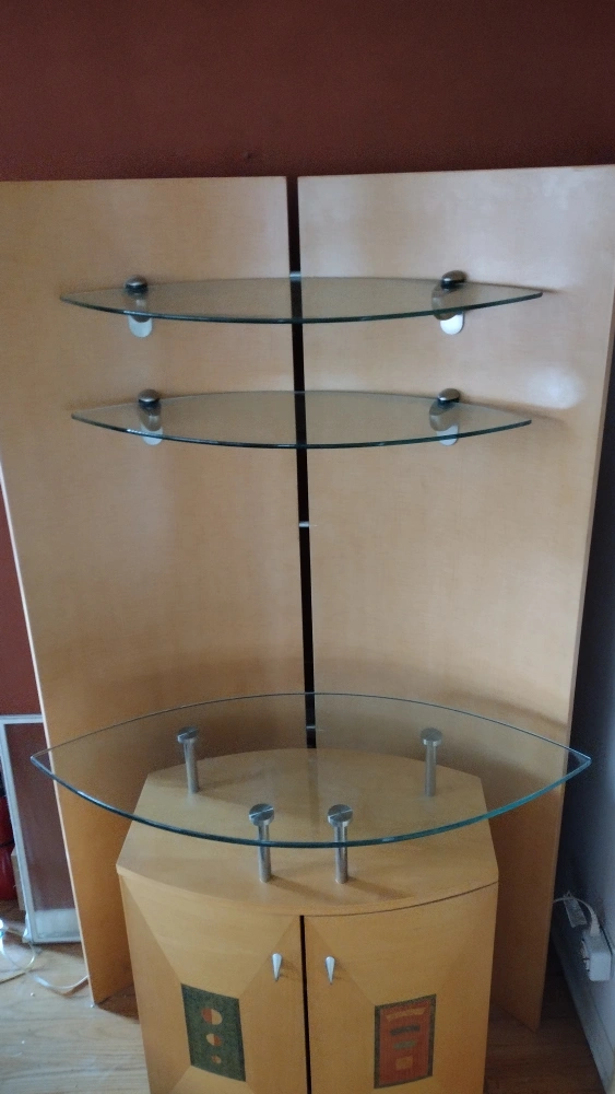 This is a unique and eye-catching display cabinet with glass shelves. It features a curved cabinet base with doors and glass shelving above. The cabinet is in good condition and would be a great addition to any home or office!
