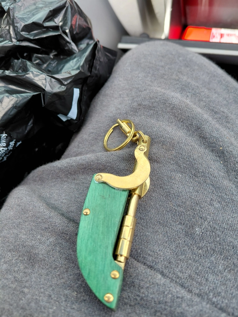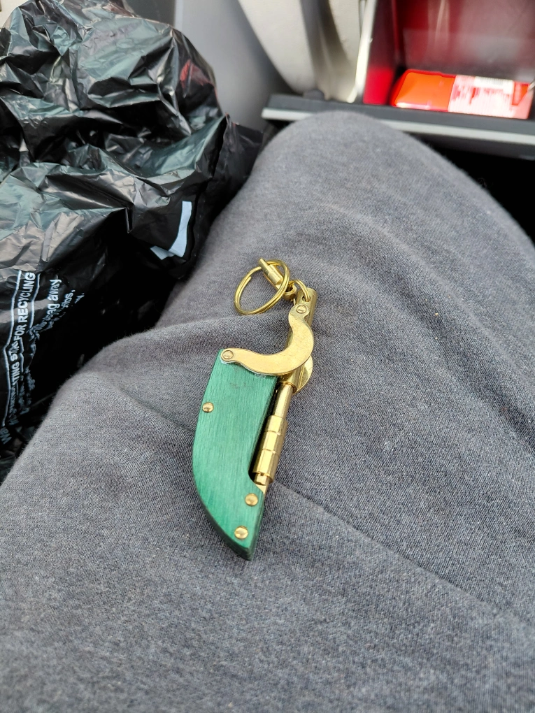 10Selling a unique keychain with a green handle and brass accents! It's in great condition and ready to add some flair to your keys