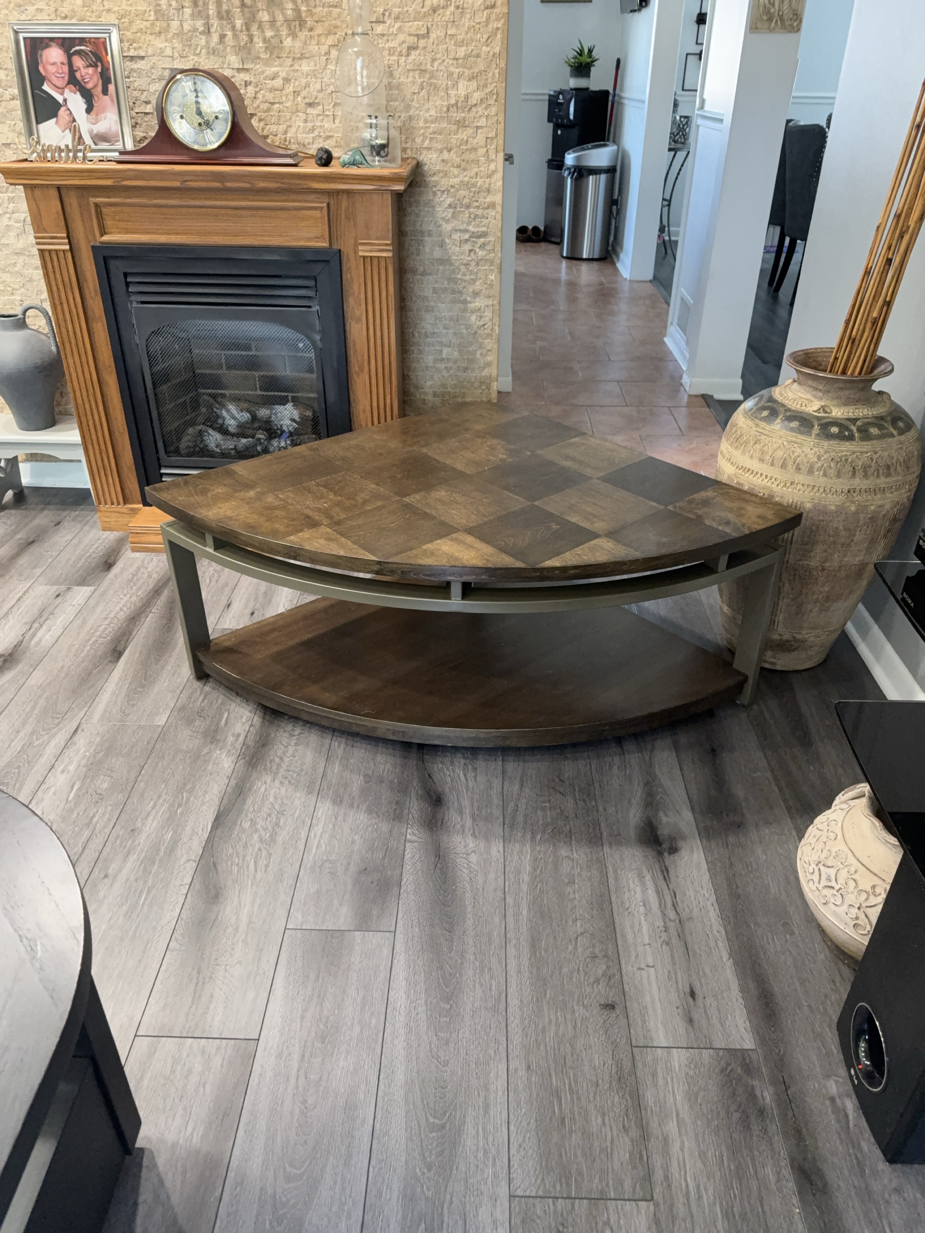 15Selling a unique half-round coffee table with a lower shelf. It features a dark brown checkered pattern on top and a neutral-colored metal frame. It's in good condition and would be a great addition to any living room
