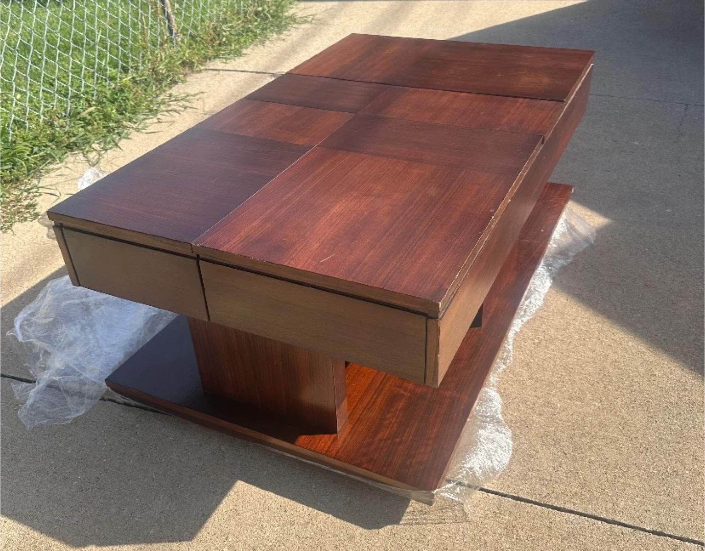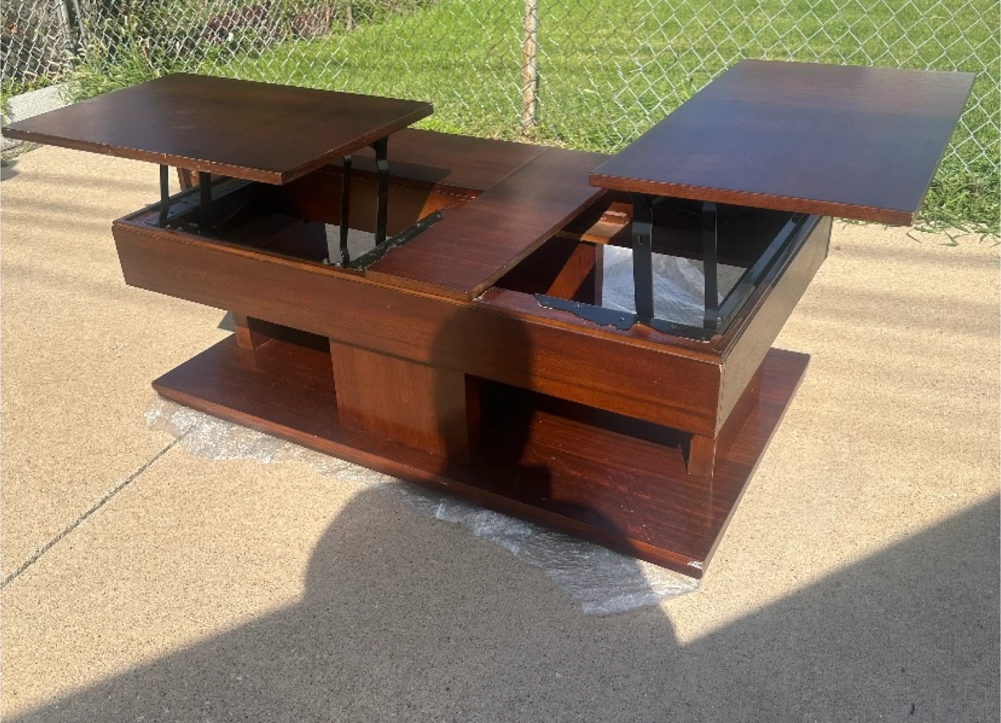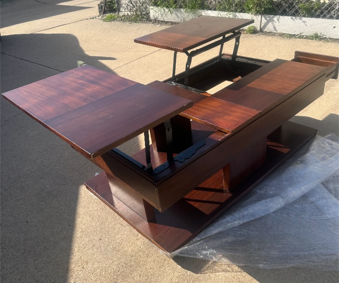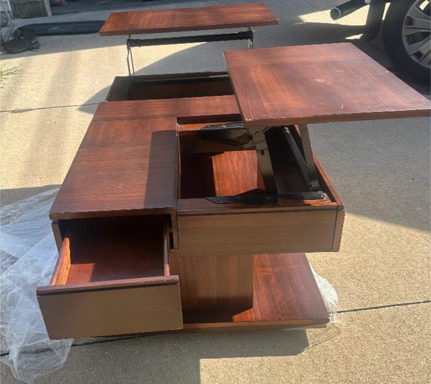 10Check out this unique coffee table! It features a lift-top design with multiple sections that can be raised. The table is a rich, dark wood color and has a unique pedestal base. It's in good condition and would be a great addition to any living room.