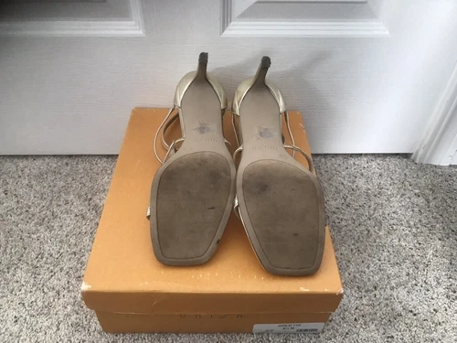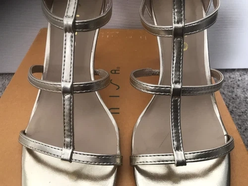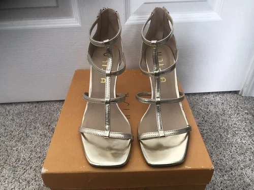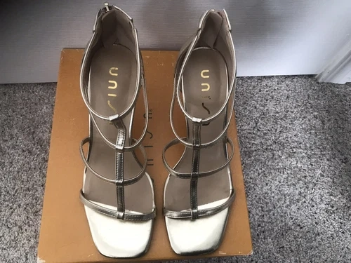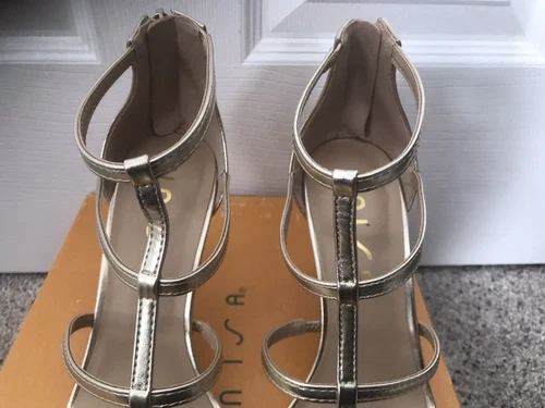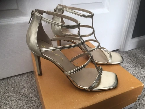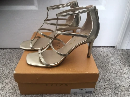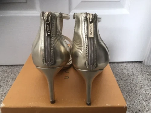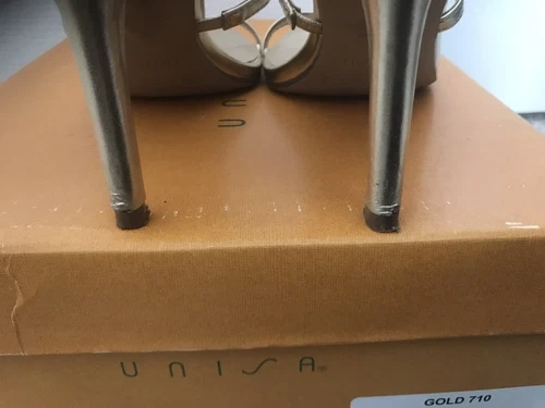 65Introducing these glamorous Unisa Gold Strap Heels, perfect for any stylish woman looking to add some shine to her footwear collection. Crafted from high-quality synthetic upper material, these pumps feature a comfortable 8.5 US shoe size and elegant ankle straps that will complement any outfit. The metal-themed design and gold color make these shoes a great addition to any wardrobe, and the heel type is ideal for maintaining balance and comfort while walking. Whether you're headed to a special occasion or a night out on the town, these Unisa Heels are the perfect chic and trendy choice. Some wear. Ask for more pictures if needed. Thx