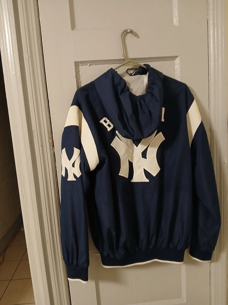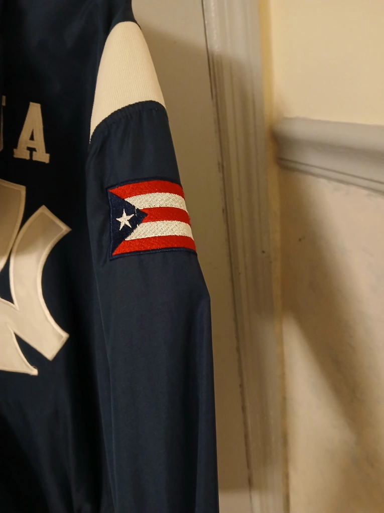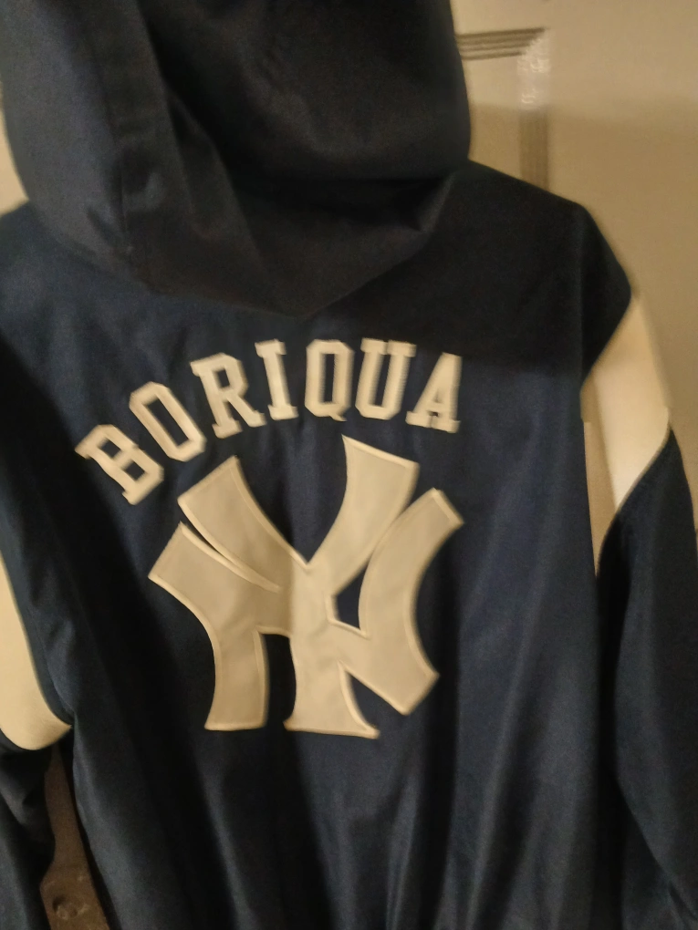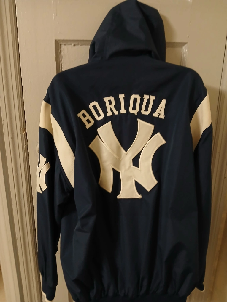 New York Yankees hooded jacket with the word "Boriqua"on the back. The jacket is navy blue with white accents. It features the Yankees logo on the back and front. It has a hood and front pockets. Puerto ๐ต๐ท Rico flag. is like new just wore it once for 2 hours is an S but runs a little big