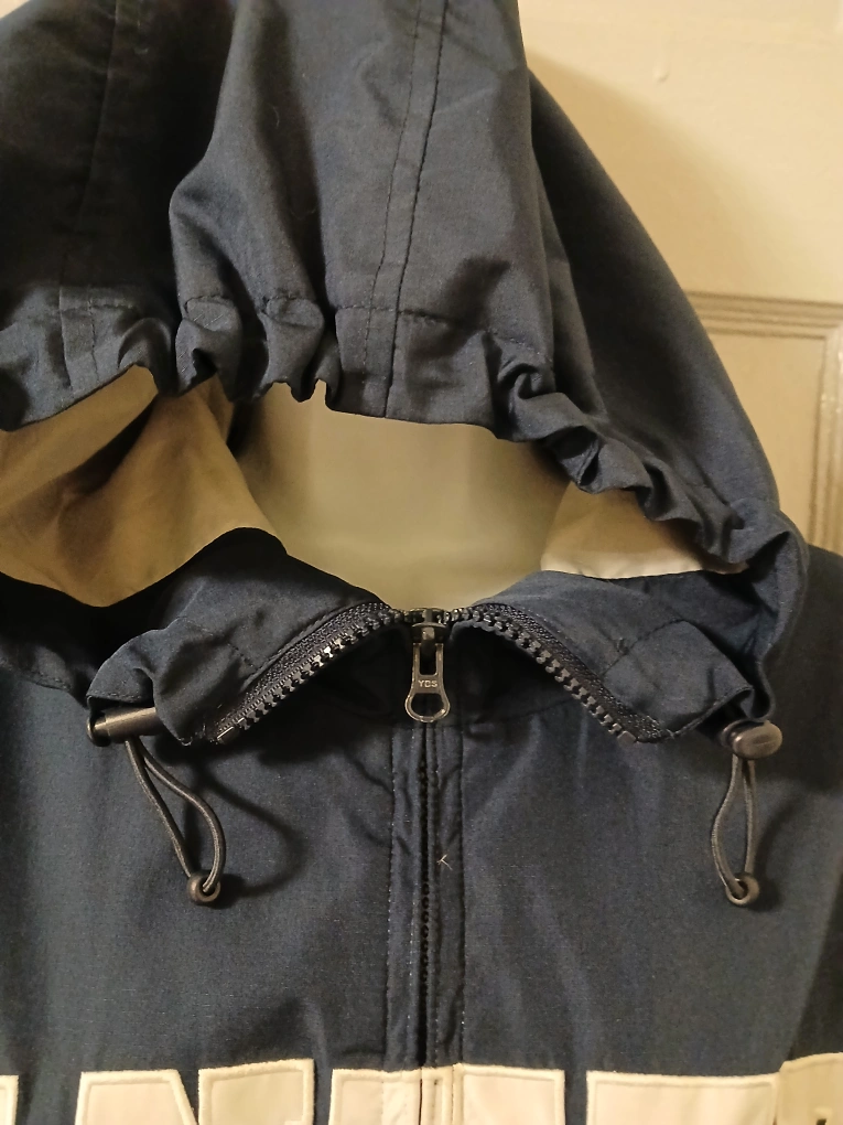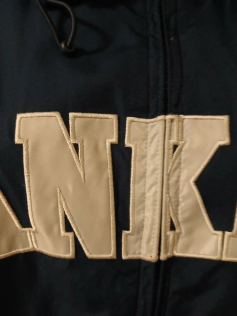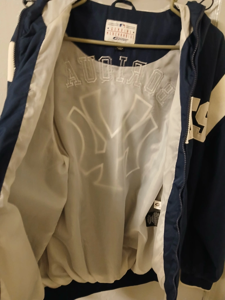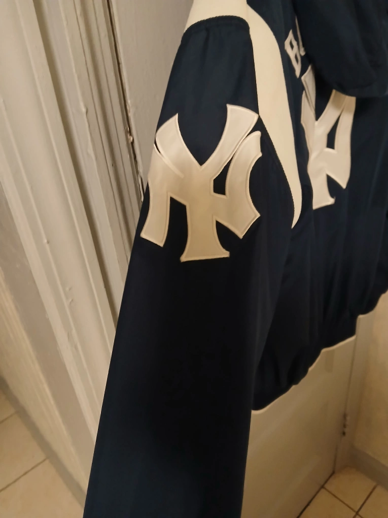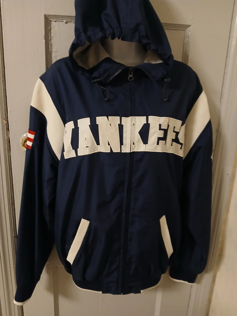 New York Yankees hooded jacket with the word "Boriqua"on the back. The jacket is navy blue with white accents. It features the Yankees logo on the back and front. It has a hood and front pockets. Puerto ๐ต๐ท Rico flag. is like new just wore it once for 2 hours is an S but runs a little big