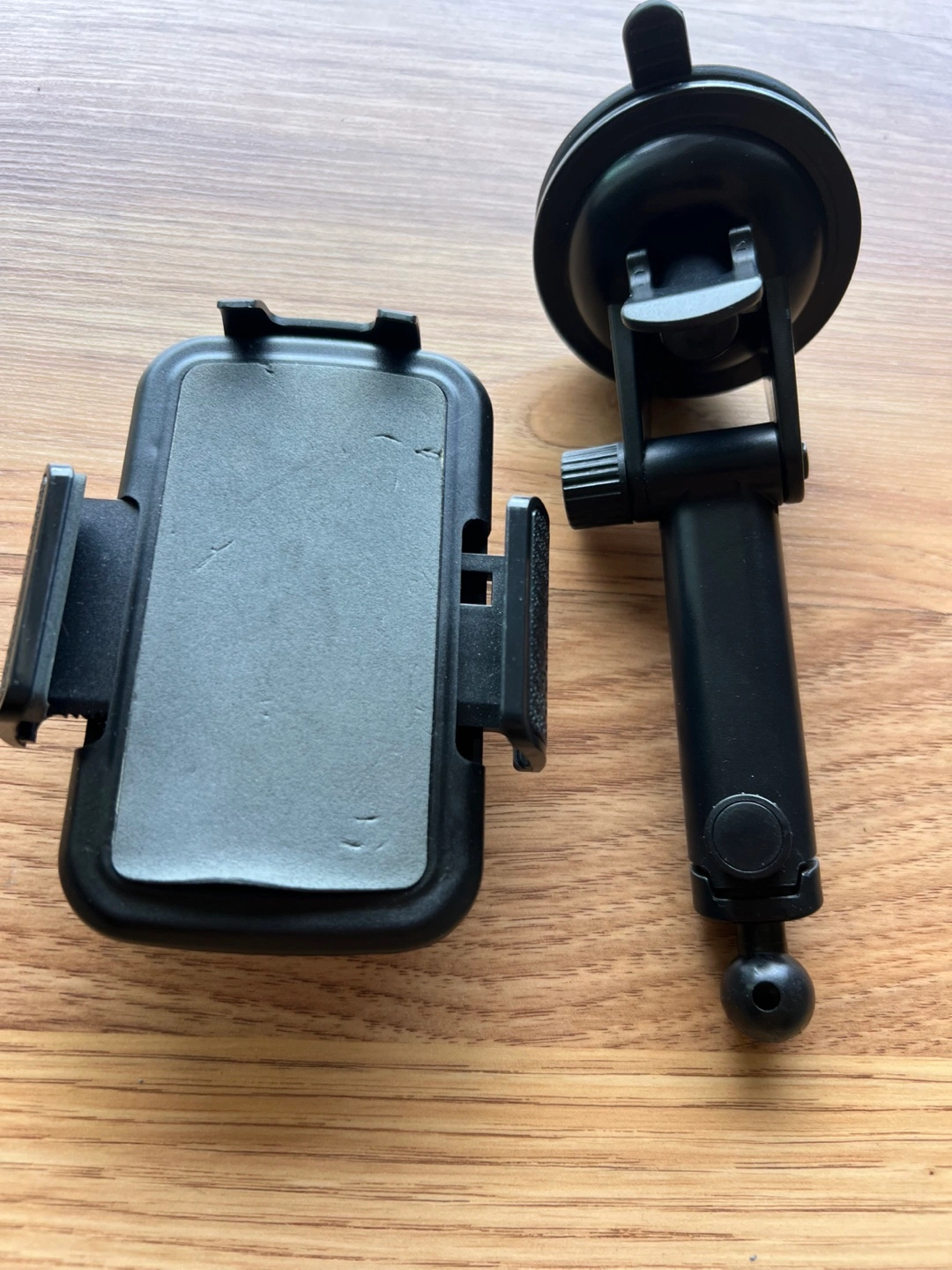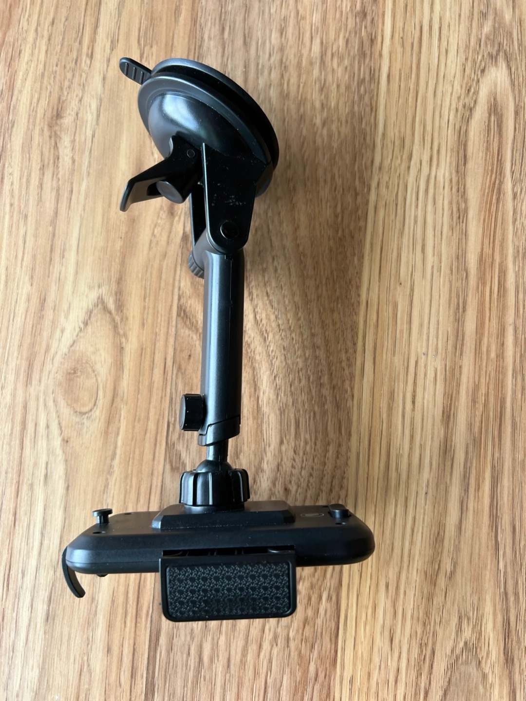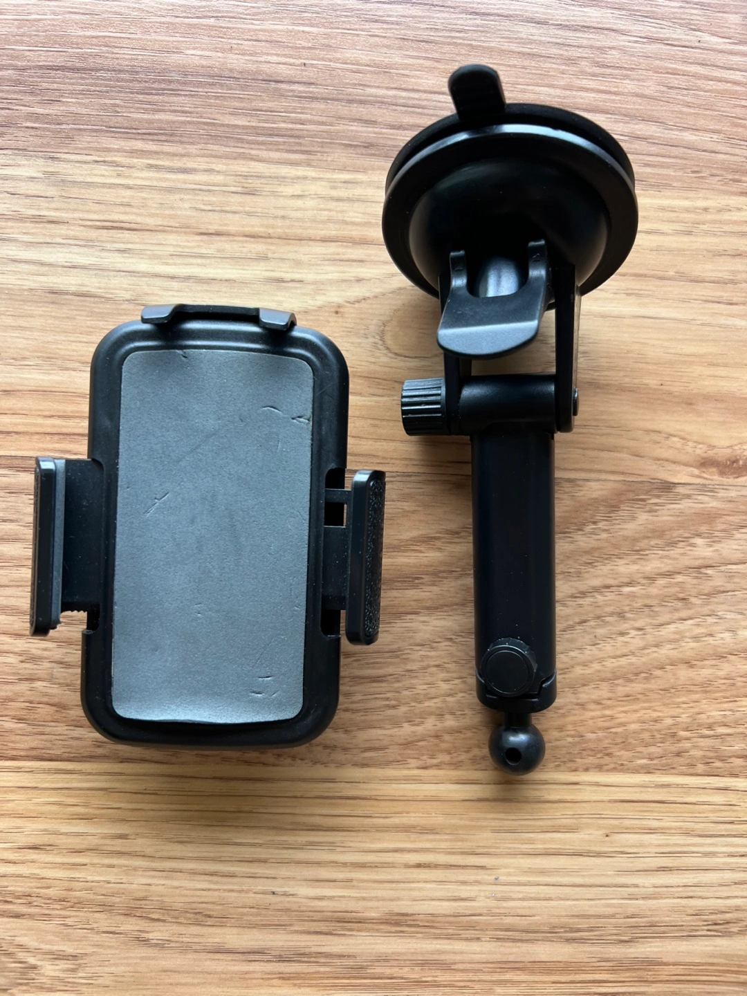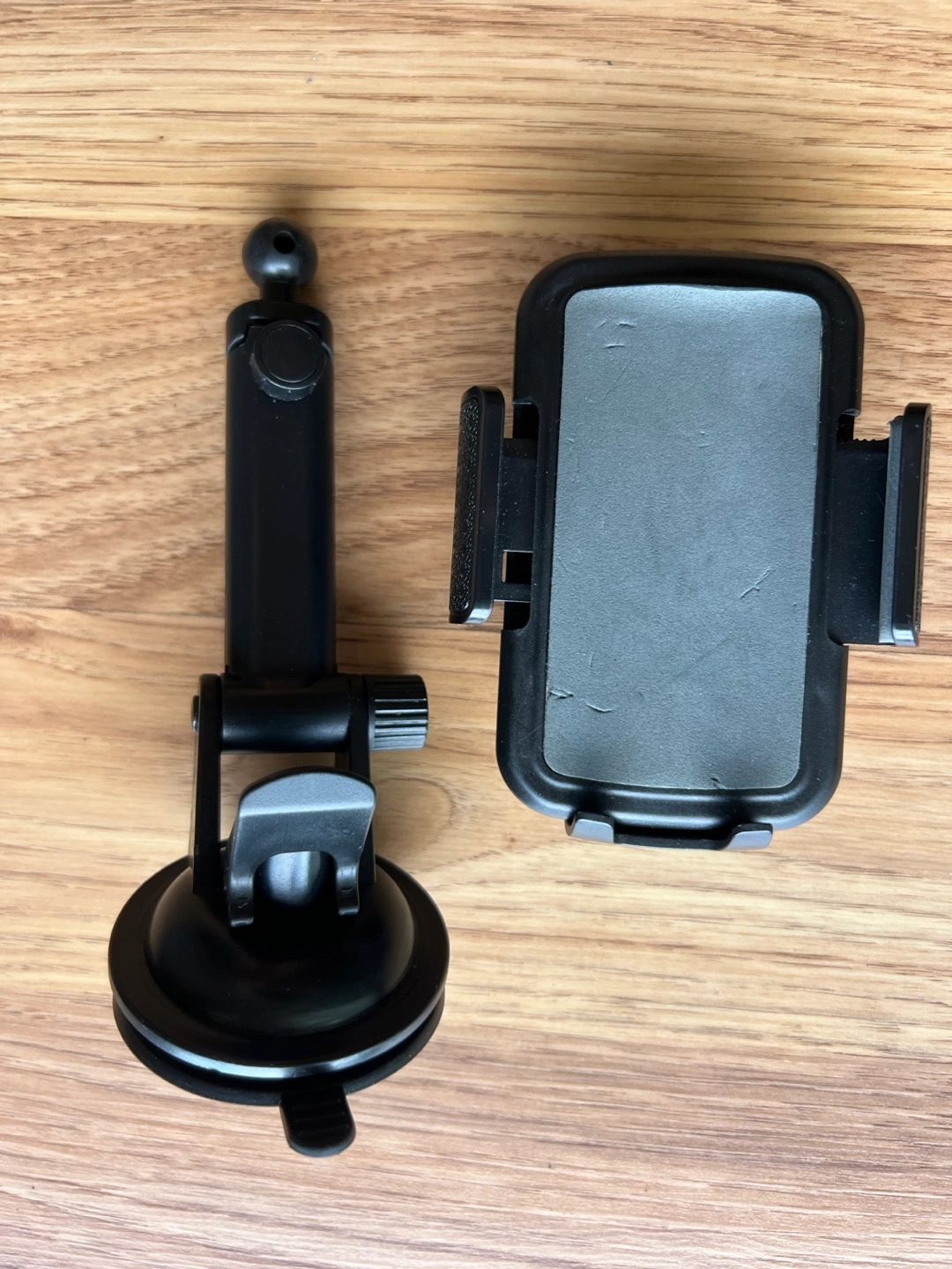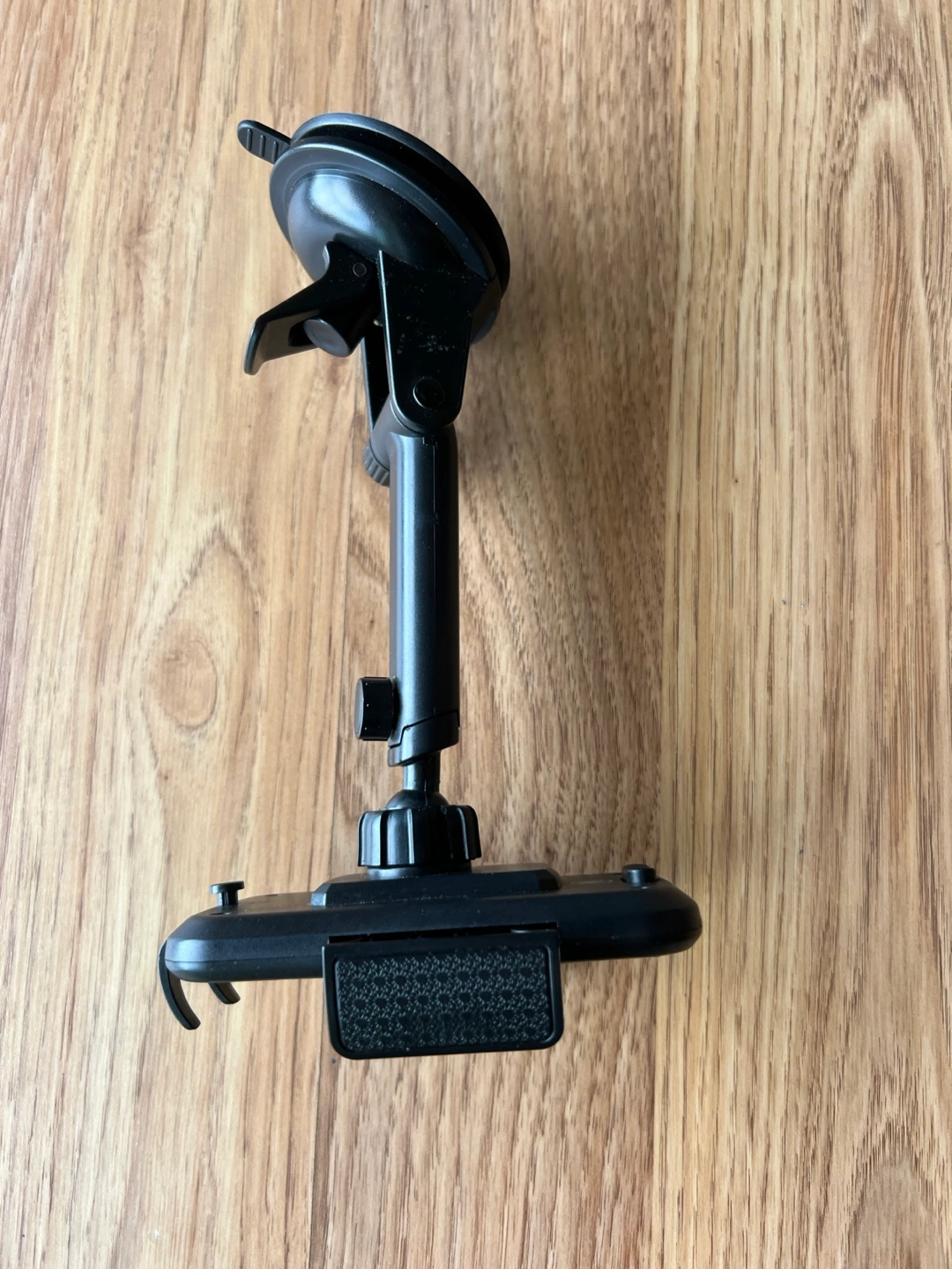 205Adjustable car phone holder. Features a suction cup mount and adjustable arm. Simple design, attaches to windshield. Holds phone securely. Good for GPS or hands-free calling.