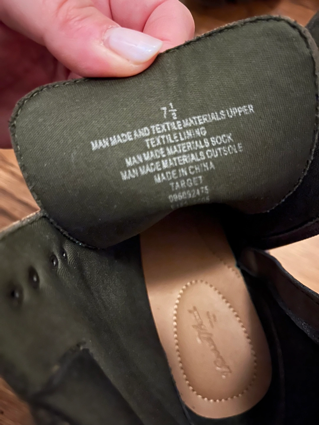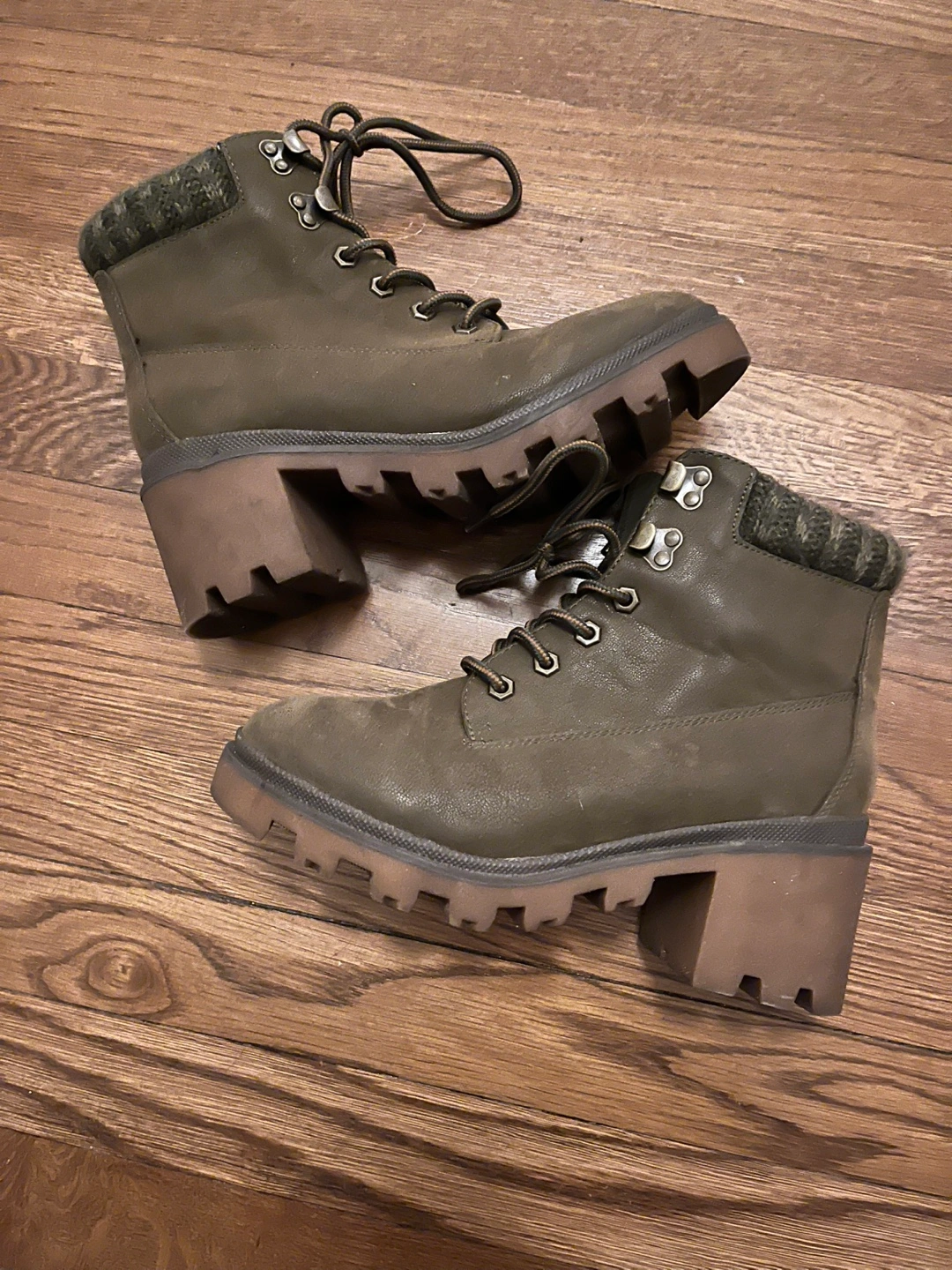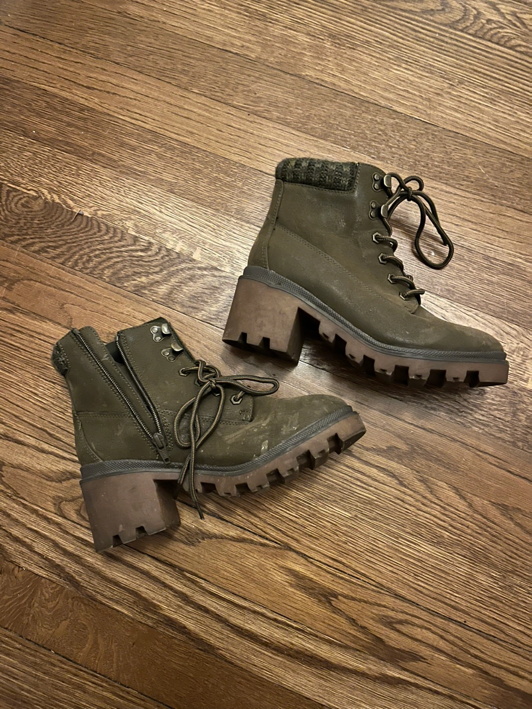 Women’s olive green boots, size 7.5. Lace up closure with a chunky heel. Great boots for fall. Only worn 2 or 3 times. Slight dirt/scuffing from storage. Can be washed off.