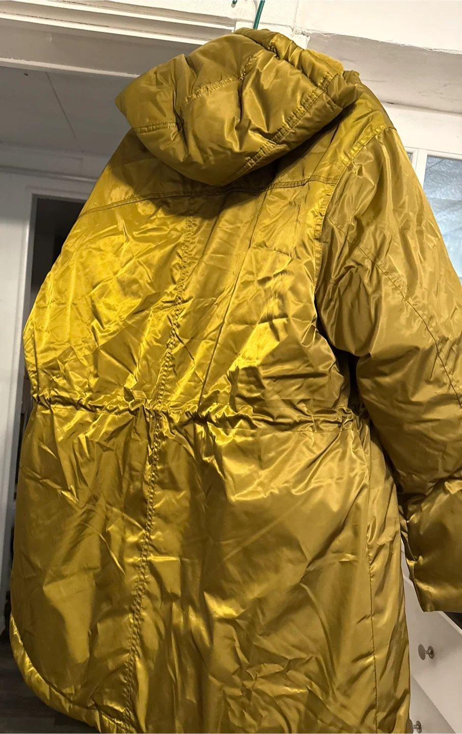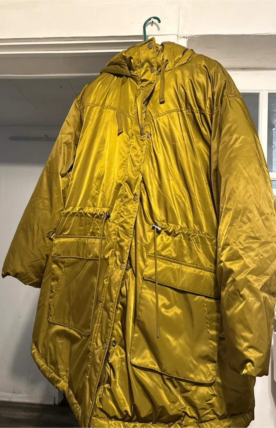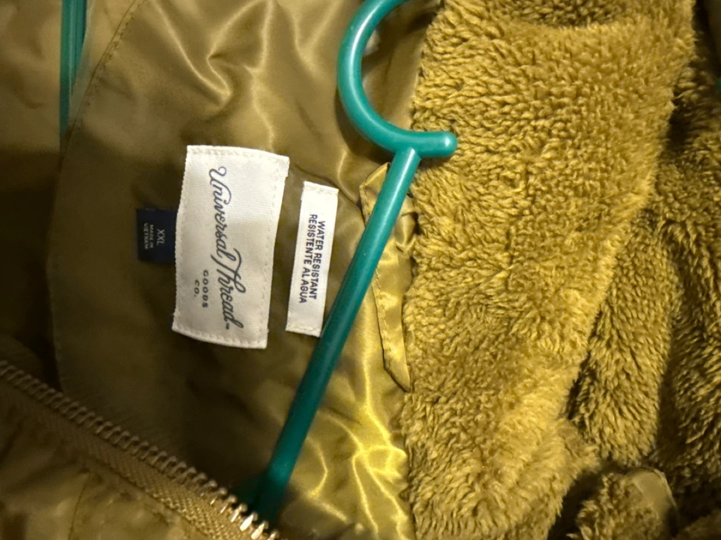 Selling a Universal Thread puffer jacket in size XXL. It's an olive green color and water resistant. Perfect for staying warm and dry!