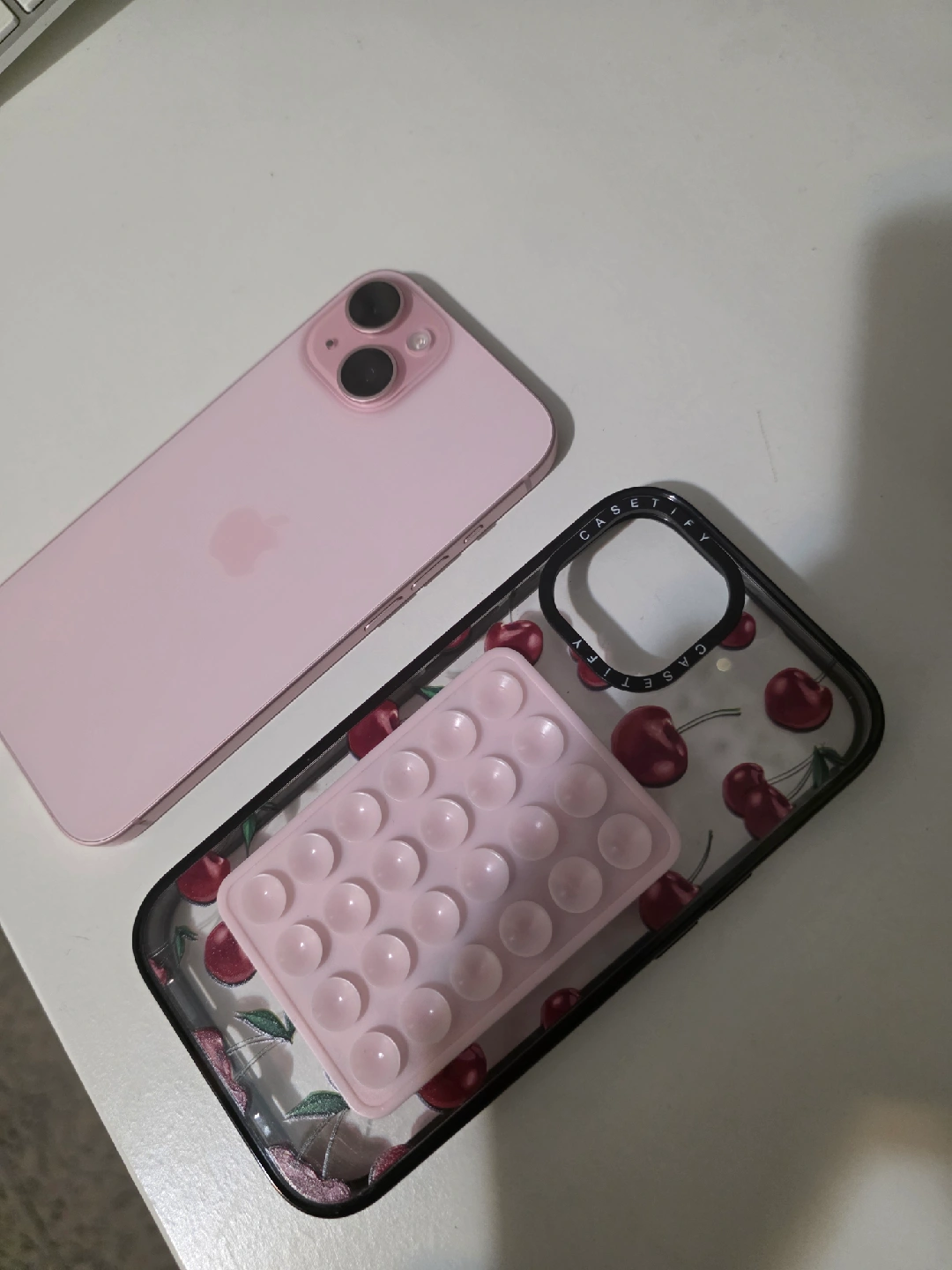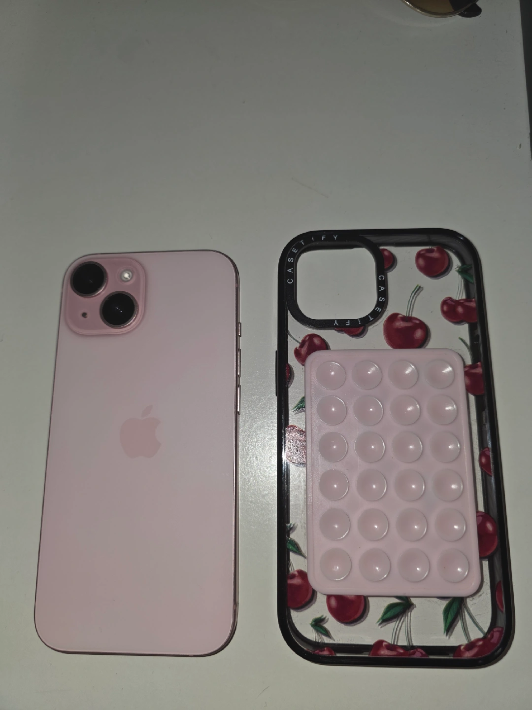 Selling a pink iPhone 15 with a Casetify cherry case! It's compact in perfect condition and ready for a new home! Battery performance is great. Let me know if you're interested! 128gb. No trades ๐