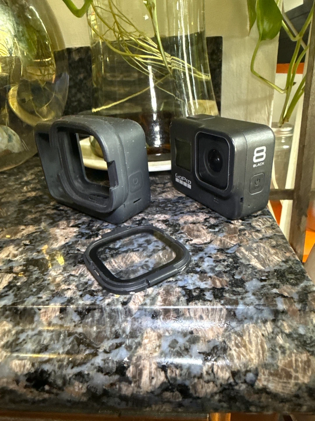 GoPro HERO8 Black action camera. Comes with a black protective housing and a lens cover. This camera is great for capturing adventures. Comes with SD Card and charging cable.