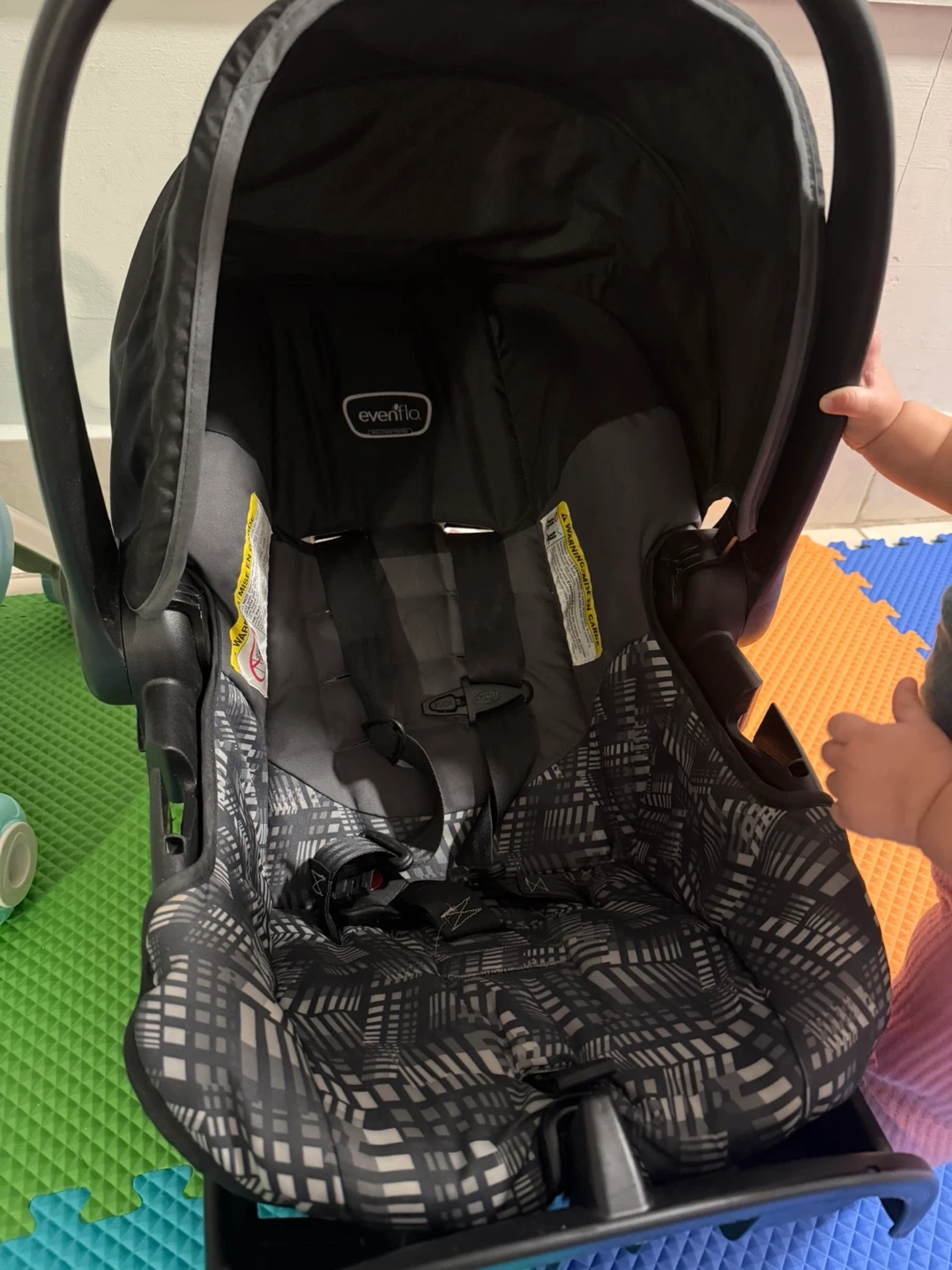 This is an Evenflo infant car seat. It features a black and gray patterned fabric with a 5-point harness. Includes canopy and base.